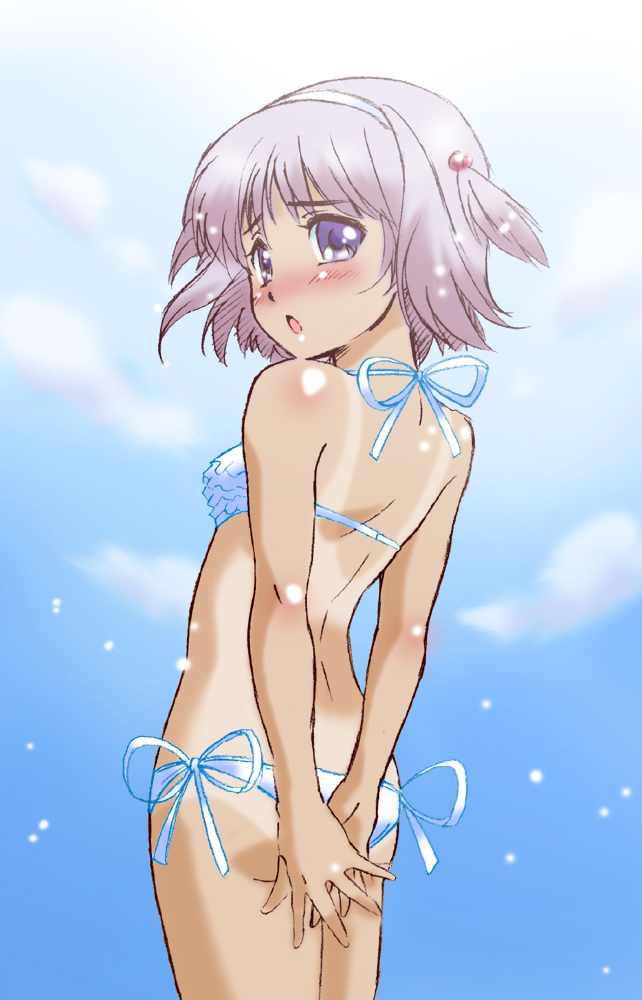 00s1girlarms behind backassbikiniblue eyesdark skindark-skinned femaleembarrassedfemale focuslooking backone-piece tanpurple hairshort hairshort twintailsside-tie bikini bottomsoloswimsuittantanlinetwintailstwo side upwhite bikini