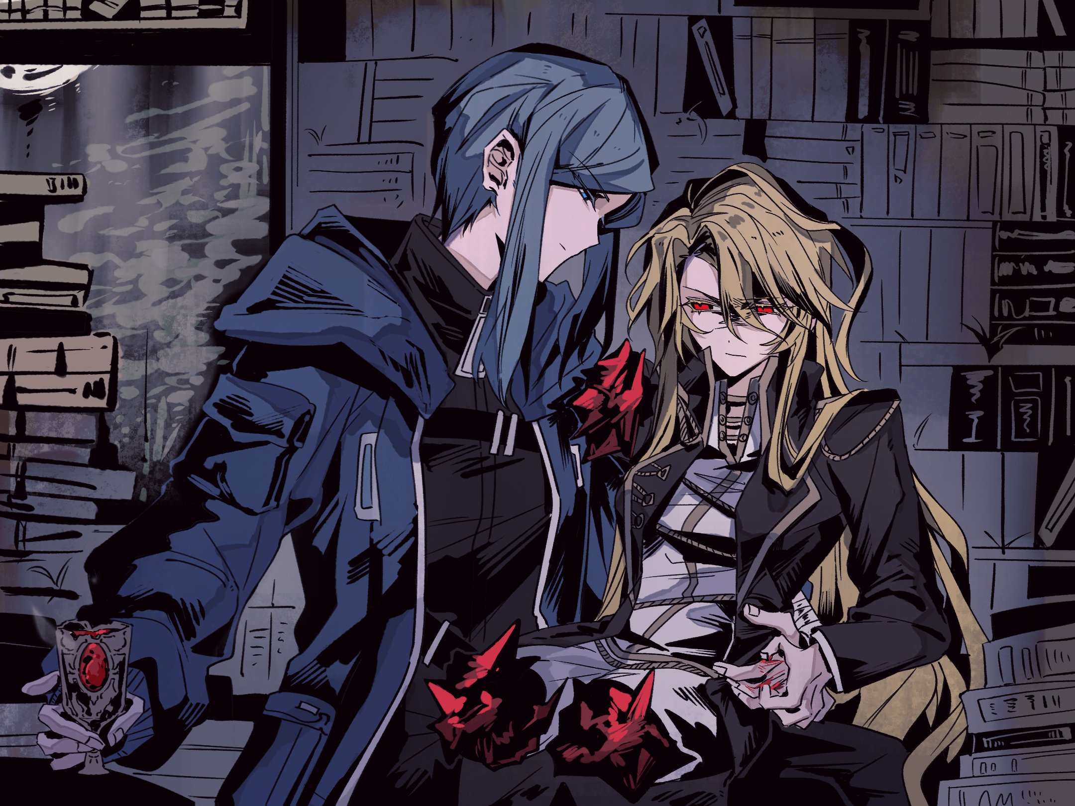 2girlsamputeeblack coatblack pantsblonde hairblue coatblue eyesblue hairbookshelfcoatcrystalgrey backgroundindoorsla manchaland (identity) (project moon)long hairlong sleeveslooking at anothermultiple girlspantsparted bangsred eyesshirtshort hairsimple backgroundsittingstandingupper bodywhite pantswhite shirt
