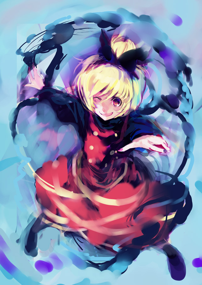 1girlblack ribbonblonde hairdressevil smilefemale focusfull bodyhair ribbonlong sleeveslooking at viewerponytailred dressred eyesribbonsmilesolo