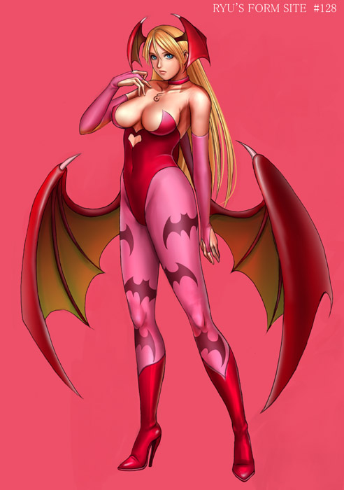 1girlalternate coloranimal printbare shouldersbat printblonde hairblue eyesbootsbreastschokercleavagecollardemon girlelbow glovesfemale focusfull bodygloveshead wingshigh heelshighleghighleg leotardlarge breastsleotardlipsticklong hairmakeuppantyhosepink pantyhoseprint pantyhosered leotardshoessimple backgroundsolostandingtattoowings