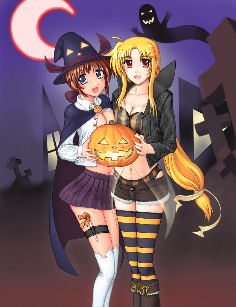 00s2girlsblonde hairblue eyesbreastsbrown haircapecleavagedenimdenim shortshair ribbonhalloweenhatjack-o'-lanternlong hairlow-tied long hairmidriffmultiple girlsnavelopen clothesopen shirtponytailpumpkinpurple eyesred eyesribbonshirtshortsskirtstriped clothesstriped thighhighsthighhighswitch hat
