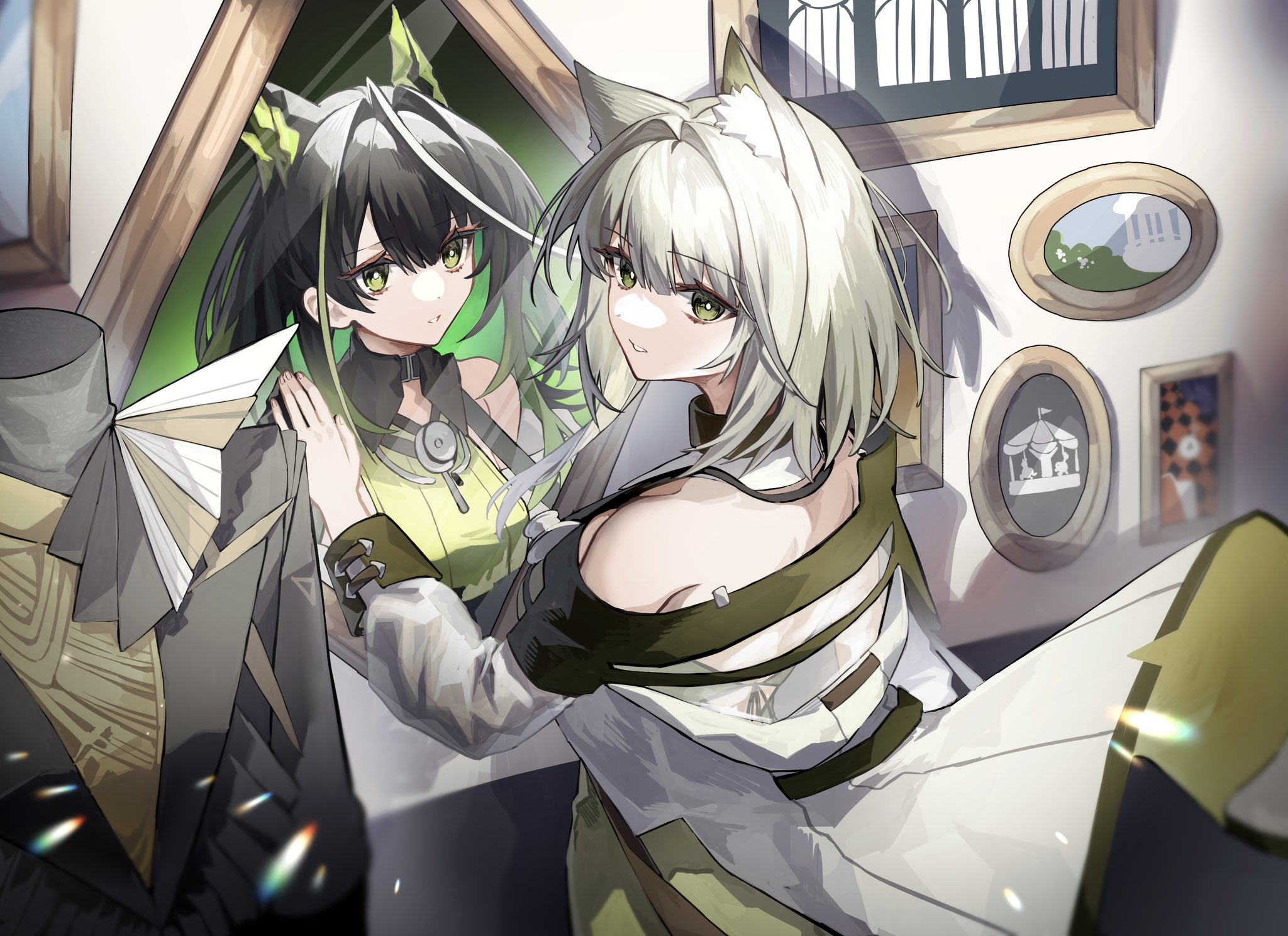 2girlsahogeanimal ear fluffanimal earsbare shouldersblack collarblack hairbreastscat earscat girlcollarcrystal hornsdetached collardifferent reflectiondressfrom behindgreen dressgreen eyesgreen hairhair between eyeshair intakeshand on mirrorhuge ahogeindoorsjacketlong sleeveslooking at viewerlooking backmannequinmedium breastsmirrormulticolored hairmultiple girlsoff shoulderoff-shoulder dressoff-shoulder jacketparted lipspicture framereflectionsidelockssleevelesssleeveless dressstethoscopestethoscope around neckstreaked hairturning headupper bodywhite collar