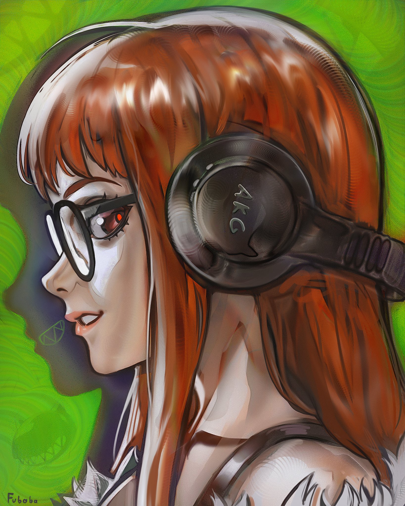 1girlbehind-the-head headphonesblack tank topblack-framed eyewearblunt bangsbrown eyescharacter namecollarbonefrom sidefur trimglassesgreen backgroundheadphoneslong hairlooking at viewerlooking to the sideorange hairparted lipsportraitprofilered pupilssidelockssmilesolotank top