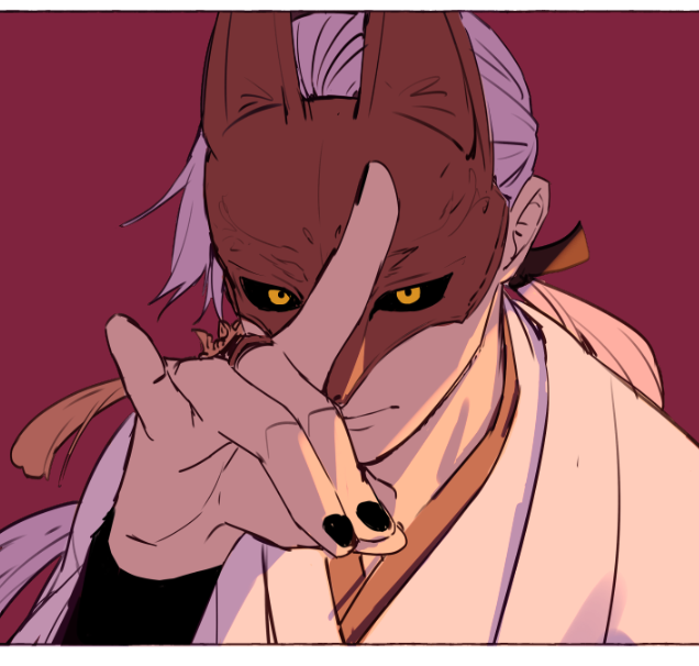 1boyblack nailsfox masklow ponytailmale focusmaskponytailrobesoloupper bodywhite hairwhite robe