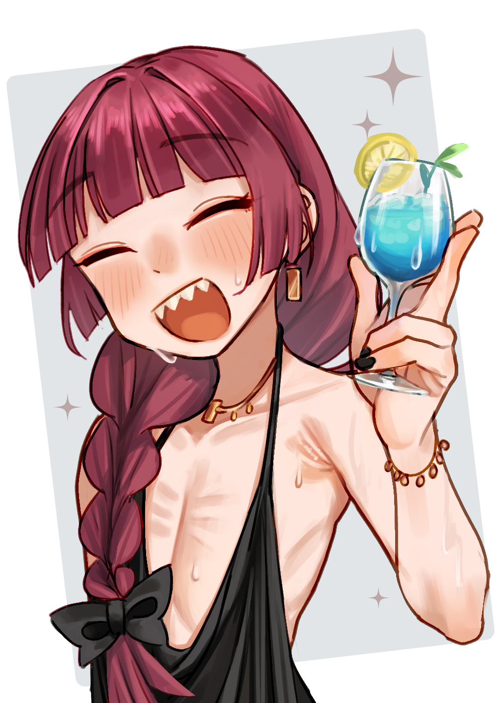 1girlbare shouldersblack dressblack nailsblunt bangsblushbowbraceletbraidclosed mouthcocktail glasscupdressdrinking glassearringsflat chestgold earringsgold necklacehair bowhair over shoulderholdingholding cupjewelrynail polishnecklaceopen mouthplunging necklinered hairsharp teethsingle braidskinnysleevelesssleeveless dresssmilesolosweatteethupper body