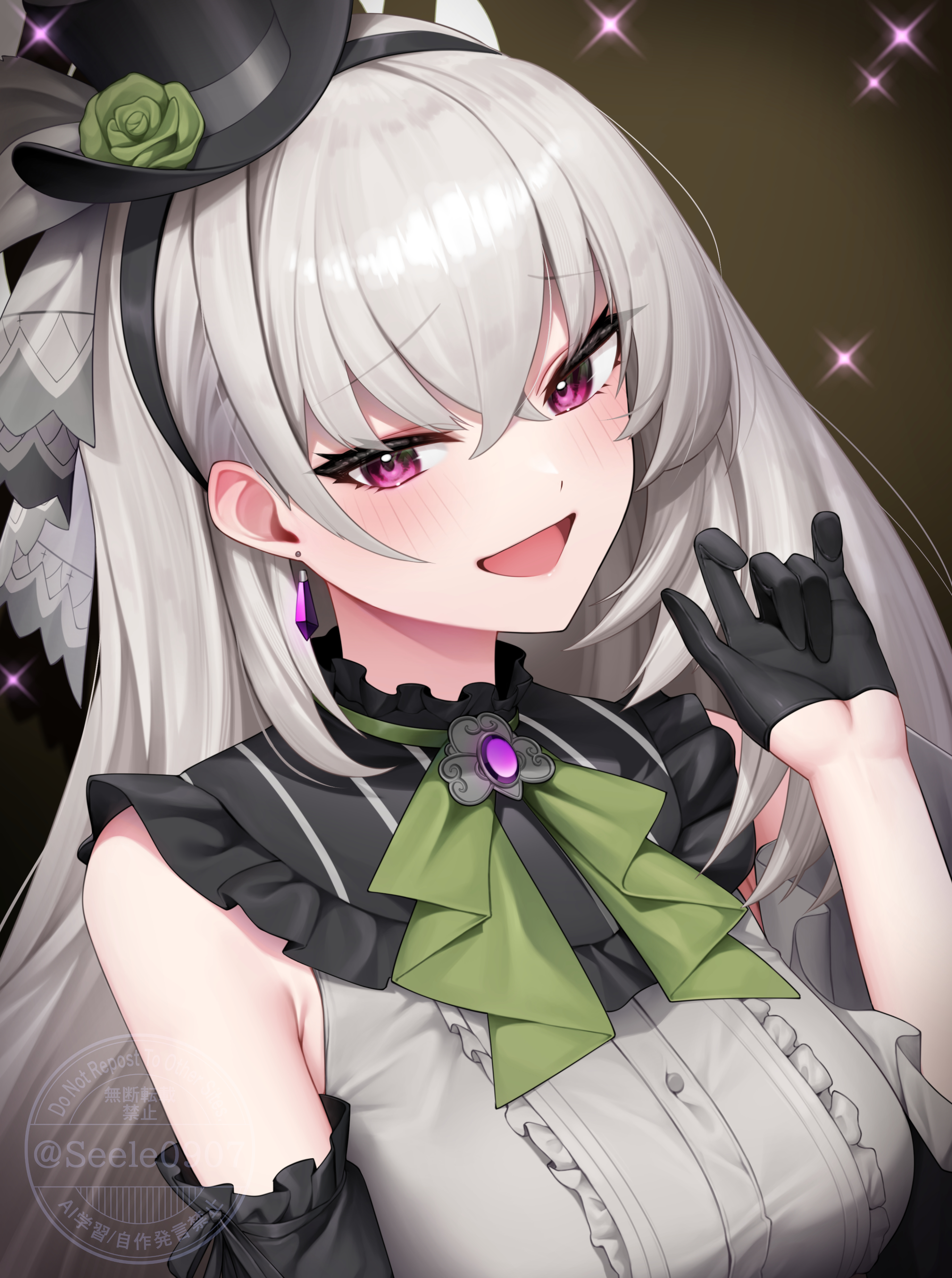 1girlartist nameascotblack dressblack glovesblack hairbandblack hatblack headbandblushbreastsbrown backgroundcrossed bangsdetached sleevesdressearringsflowerfrilled dressfrilled sleevesfrillsgemglovesgradient backgroundgreen ascotgreen flowergreen rosegrey dressgrey hairhair between eyeshairbandhalf gloveshalohand uphathat flowerheadbandidolidol clothesjewelrylong hairlooking at viewermini hatmini top hatmulticolored dressofficial alternate costumeopen mouthpink eyespurple gemstonerosesimple backgroundsmilesolosparkletop hattwo-tone dressupper bodywatermarkwhite halo