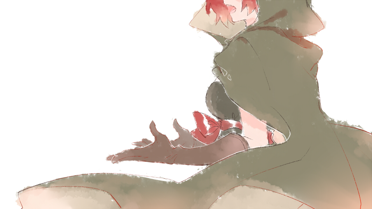 1girlbreastsbrown glovescloakdresseyes out of frameglovesgreen cloakgreen dresshead out of framehoodhood uphooded cloakmedium breastsred hairsimple backgroundsoloupper bodywhite background