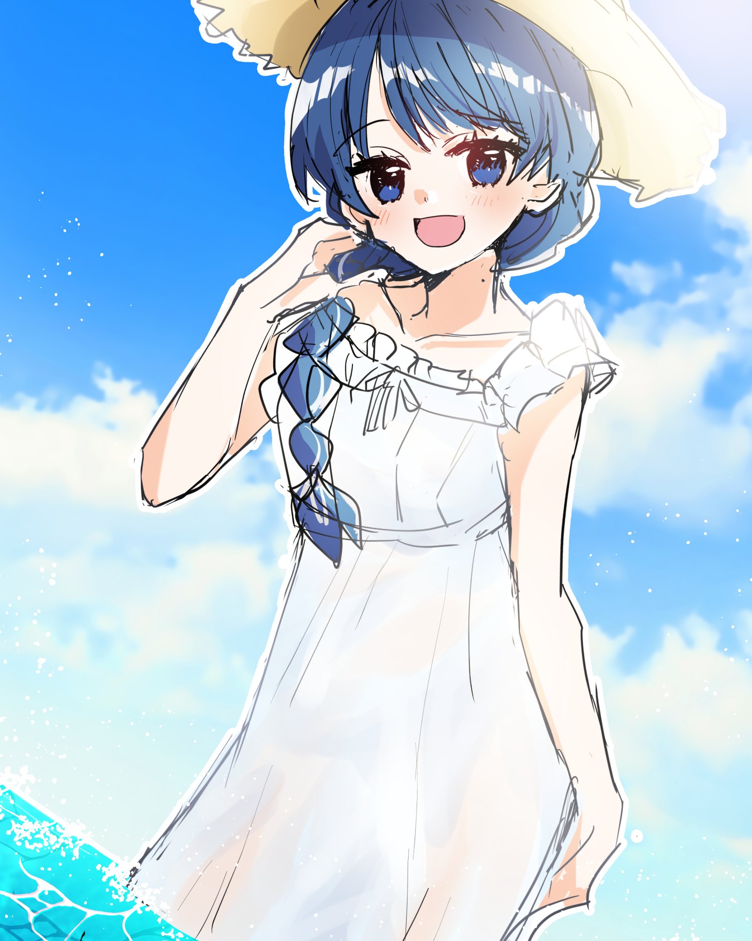 :d1girlblue eyesblue hairblushbraidbrown hatcollarbonedresshatlong hairlooking at viewermolemole on neckmurano sayaka (very! very! coconatsu casual)official alternate costumeopen mouthsingle braidsleevelesssleeveless dresssmilesolostraw hatsundressvirtual youtuberwadingwhite dress