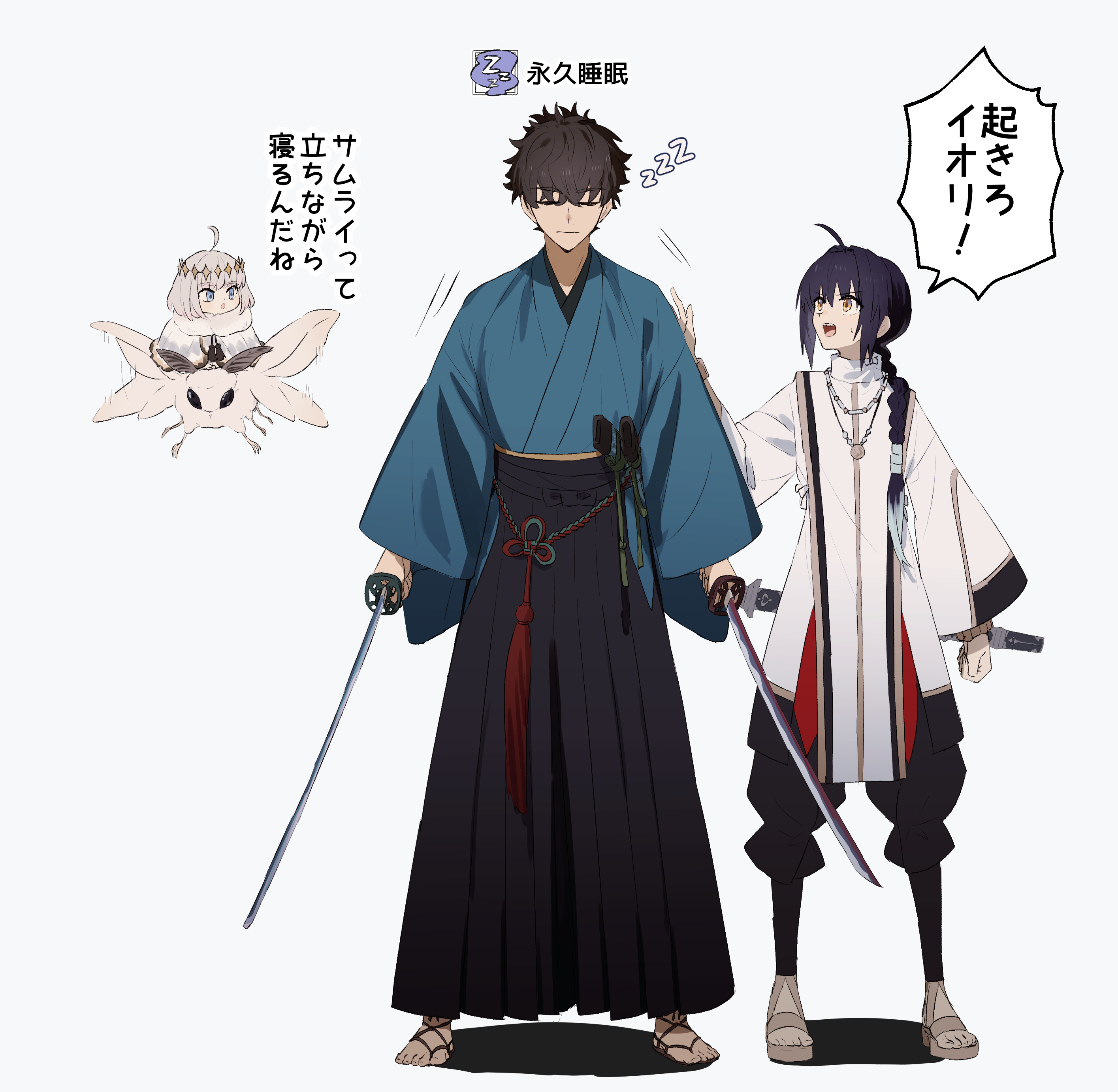 1other2boysahogebraidbugclosed mouthdual wieldingfull bodyhair over shoulderhakamaholdingholding swordholding weaponinsectjapanese clothesmothmultiple boysopen mouthpattingridingsandalsshort hairsleepingspeech bubblespoken zzzstandingswordweaponwide sleeveszzz
