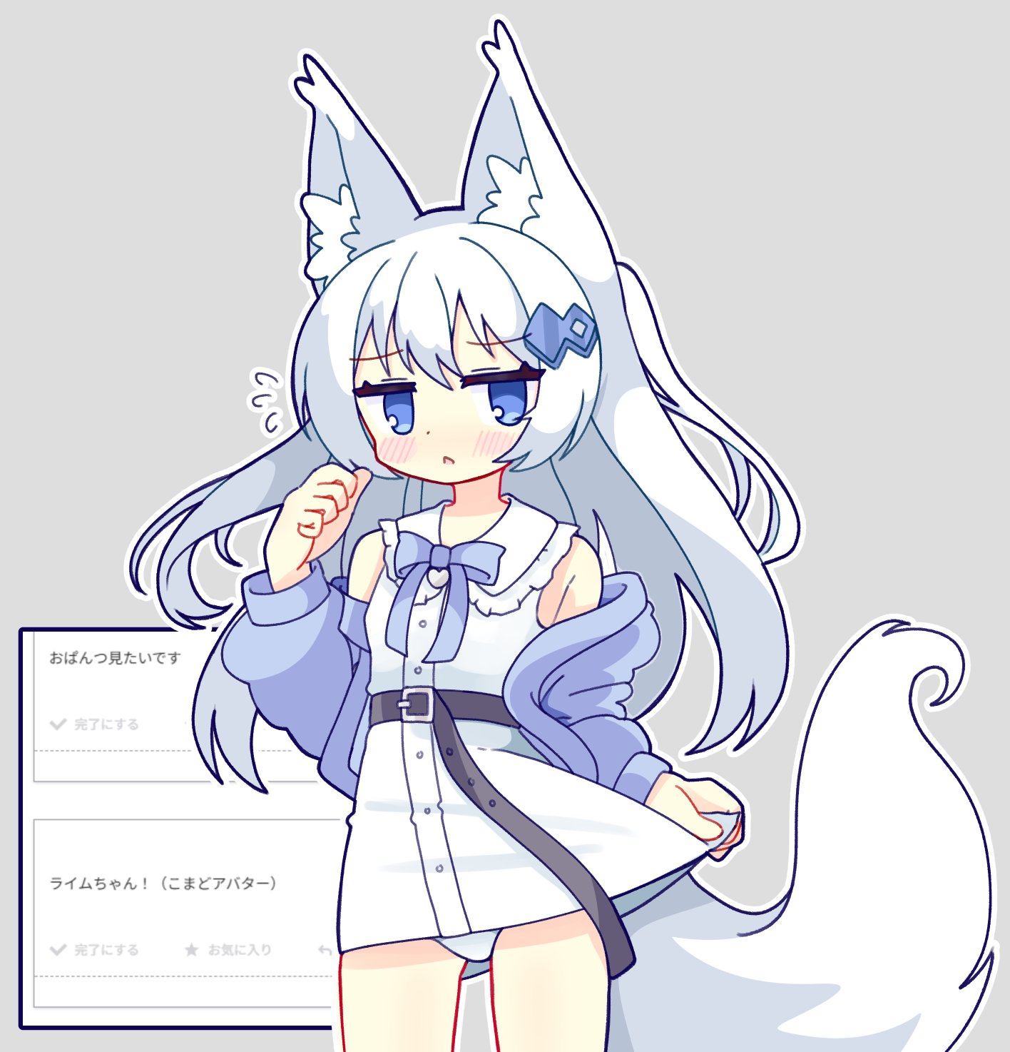 1girlanimal ear fluffanimal earsbeltblue bowblue eyesblue jacketblushbowclothes grabcowboy shotflying sweatdropsfox earsfox girlfox tailgrey backgroundhair ornamentjacketlong hairno pantsopen clothesopen jacketpantiesrequest insetshirtshirt grabsleevelesssleeveless shirtsolotailtriangle mouthtwo side upunderwearwhite hairwhite pantieswhite shirt