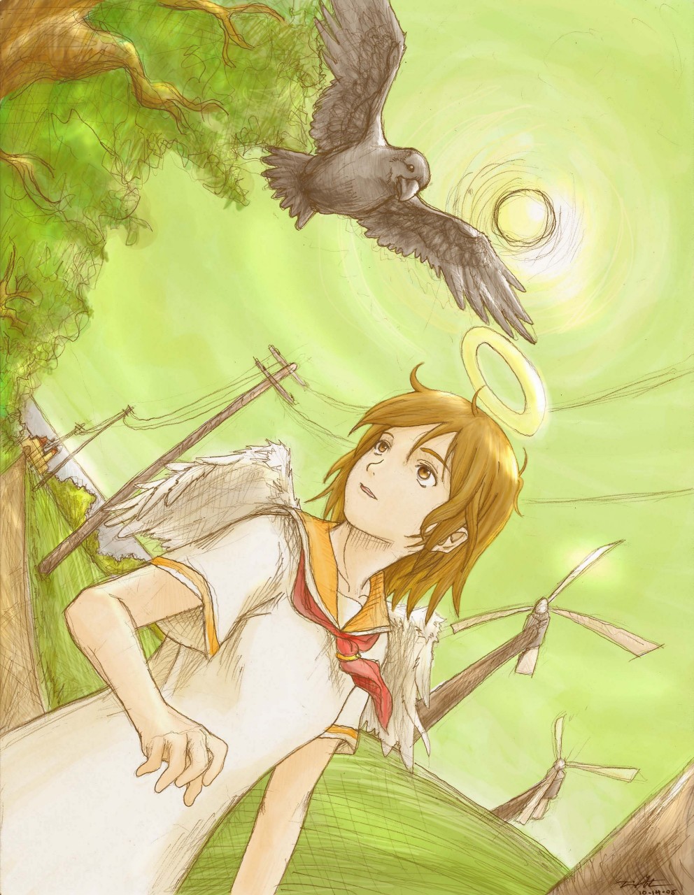 00s1girlangel wingsbirdbrown eyesbrown haircrowdutch anglefemale focushalopower linessailor collarschool uniformshort hairsolostatic clingsuntraditional halowind turbinewindmillwings