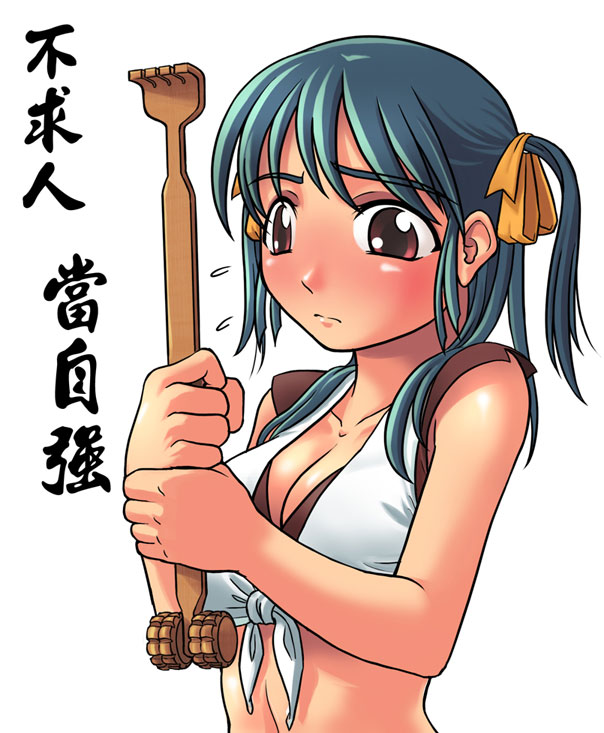1girlbackscratcherbreastschinese textcleavagefemale focusfront-tie topgreen hairhair ribbonlong hairred eyesribbonsolo