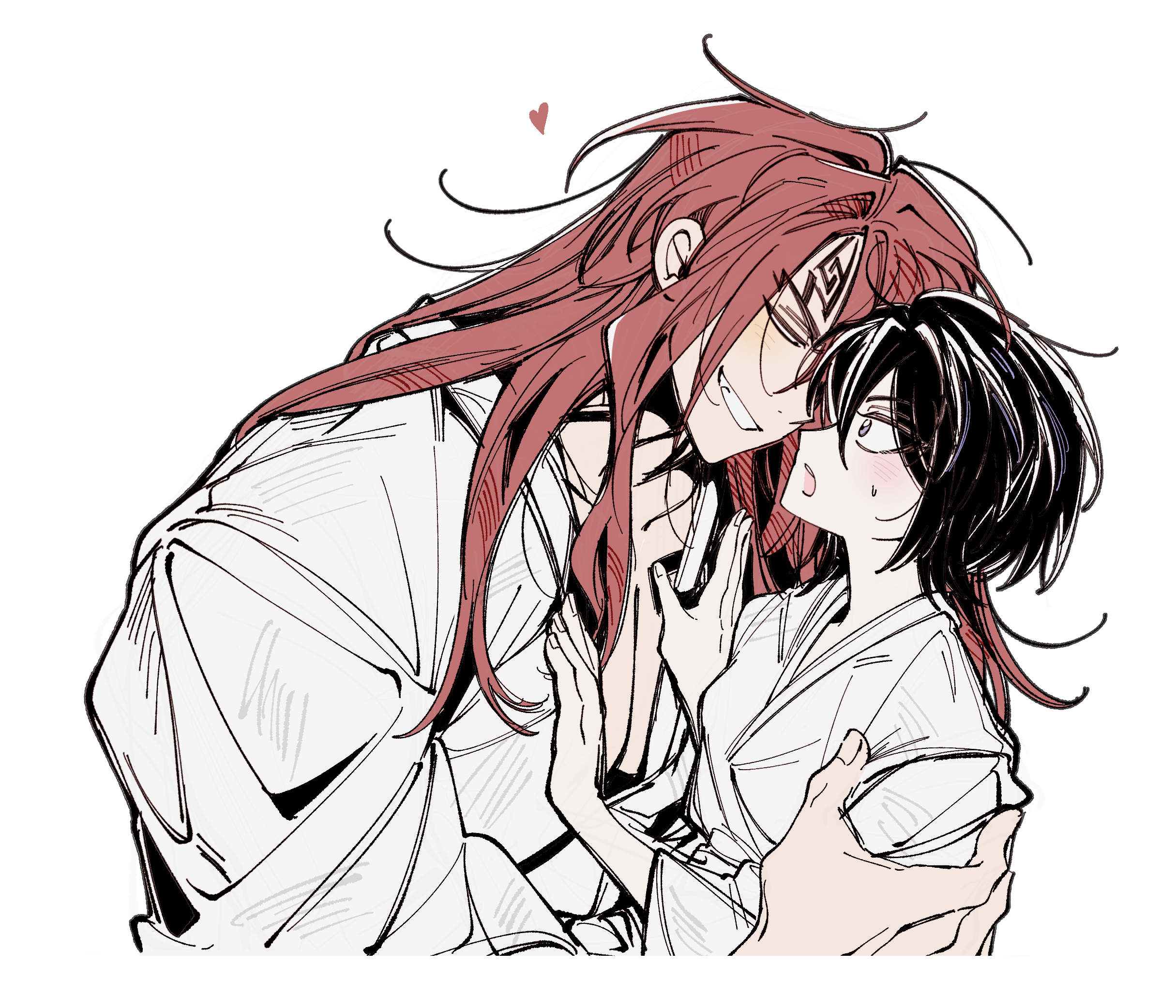 1boy1girl7hrhk77black hairblushbreastscoupleforehead tattoogrinhair between eyeshand on another's shoulderhands on another's chestheterojapanese clotheskimonolong hairlooking at anothermedium hairopen mouthparted bangsparted lipsred hairsmall breastssmilesweatdroptattooteethupper bodywhite backgroundwhite kimono