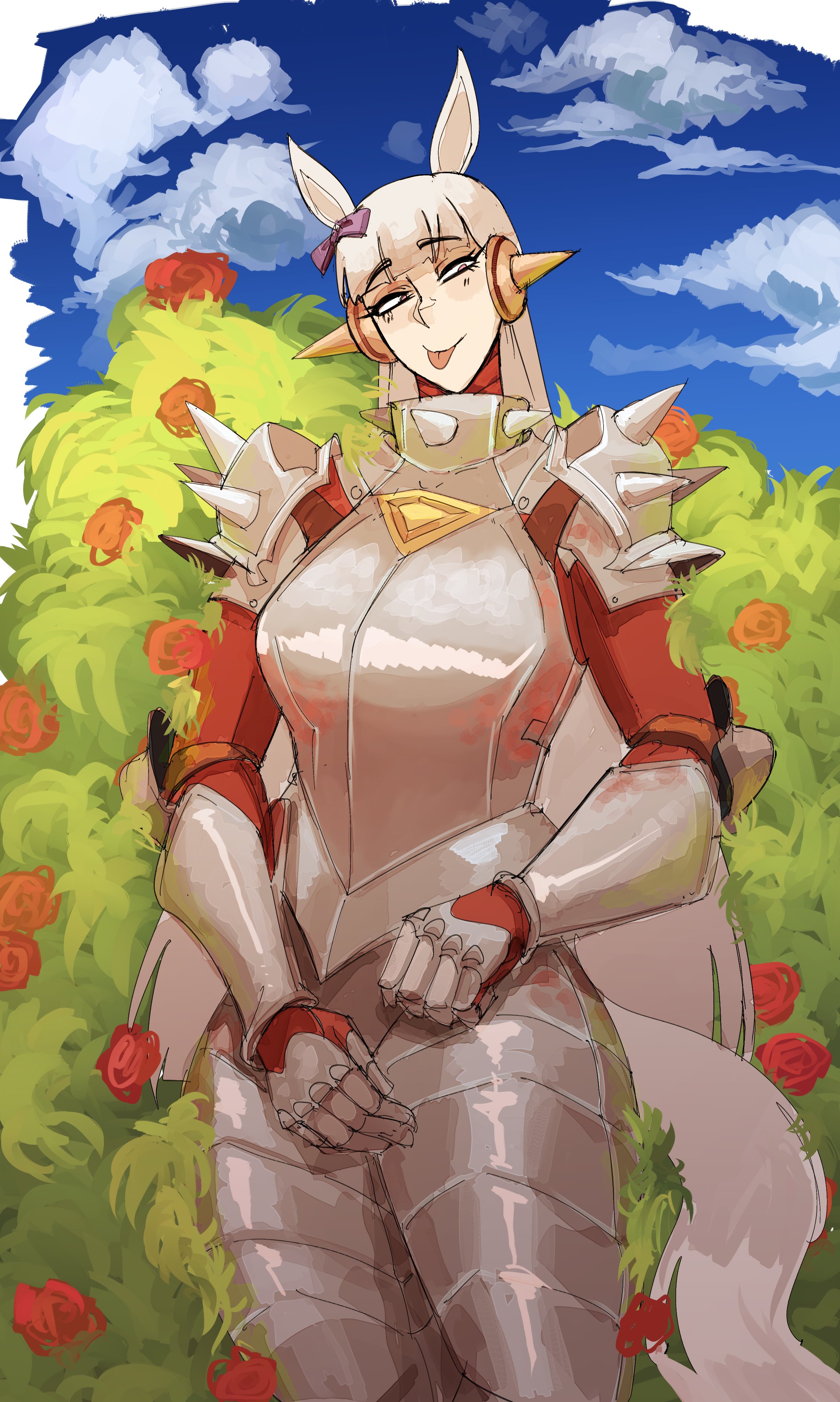 alternate costumeanimal earsarmorbowfull armorgrey tailhorse earshorse girlhorse tailknightmedievalpurple bowtailtonguetongue out