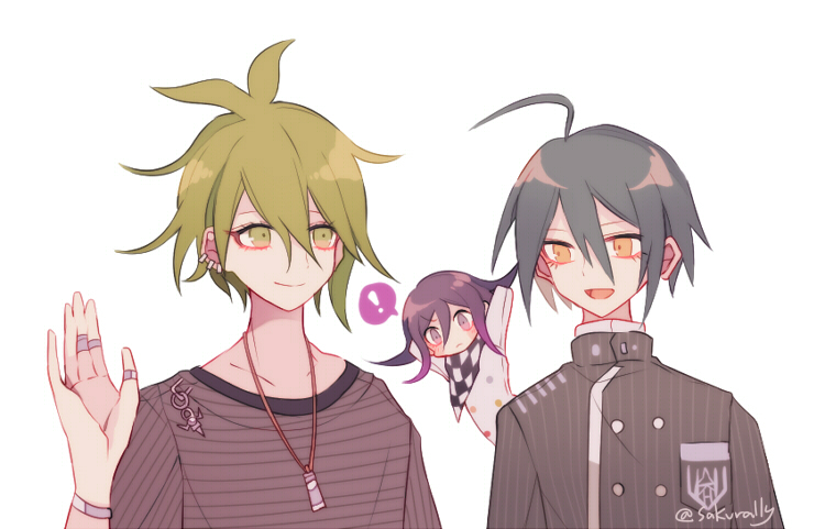1boy3boysaegyo salahogeantenna hairarms behind headblack hairblack jacketblack scarfblue shirtbraceletbreast pocketbroochbuttonscheckered clothescheckered scarfchibiclosed mouthcollarbonecollared jacketcrestdouble-breastedear piercingeye contacteyelashesfrowngreen eyesgreen hairhair between eyeshand uphappyhigh collarjacketjewelrylong eyelasheslong hair between eyeslong sleeveslooking at anothermale focusmedium hairmessy hairmulticolored buttonsmultiple boysmultiple piercingsmultiple ringsopen mouthpendantpiercingpinstripe jacketpinstripe patternpocketpurple eyesringscarfshirtshort hairshort sleevessimple backgroundsmilespeech bubblespoken exclamation markstriped clothesstriped shirttwitter usernametwo-tone scarfundershirtupper bodyvertical-striped sleeveswhite backgroundwhite jacketwhite scarfyellow eyes