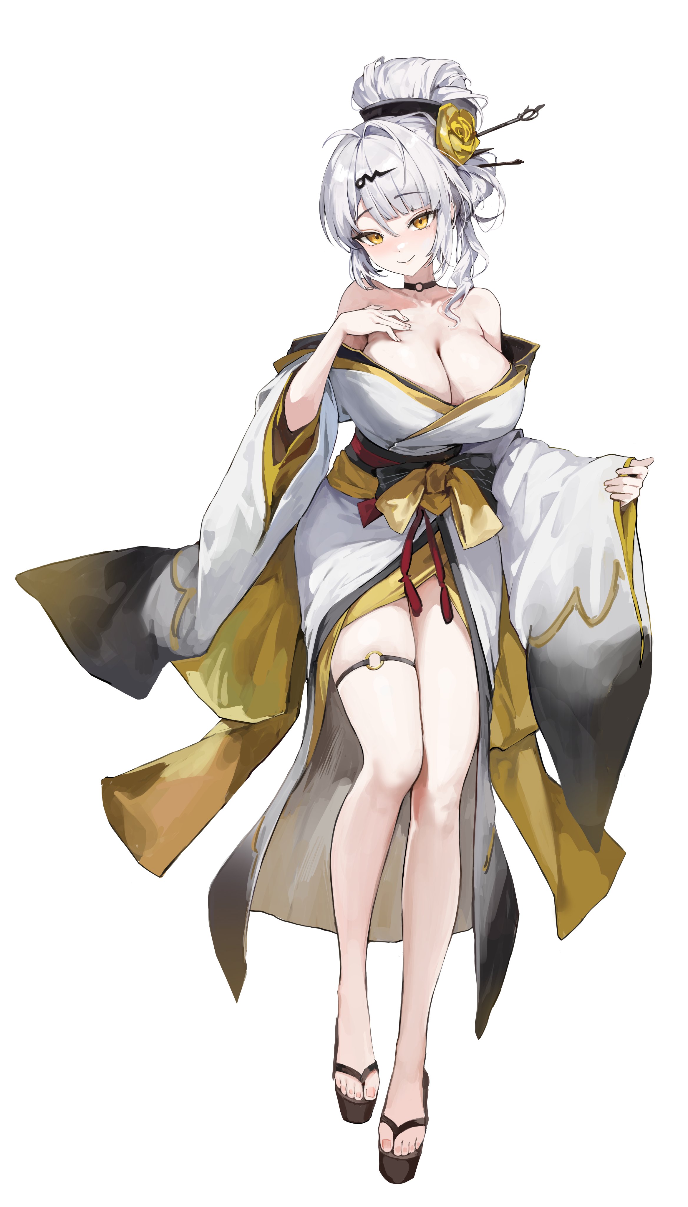 1girlahogealternate costumealternate hairstylebare legsbare shouldersblushbreastschokercleavageclosed mouthcollarboneflowerfull bodyhair flowerhair ornamenthand on own chesthuge breastsjapanese clotheskimonolegslong sleeveslooking at viewero-ringo-ring chokero-ring thigh strapoff shouldersandalssidelockssimple backgroundsingle hair intakesmilesolothigh strapthighstoeswhite backgroundwhite kimonoyellow flower