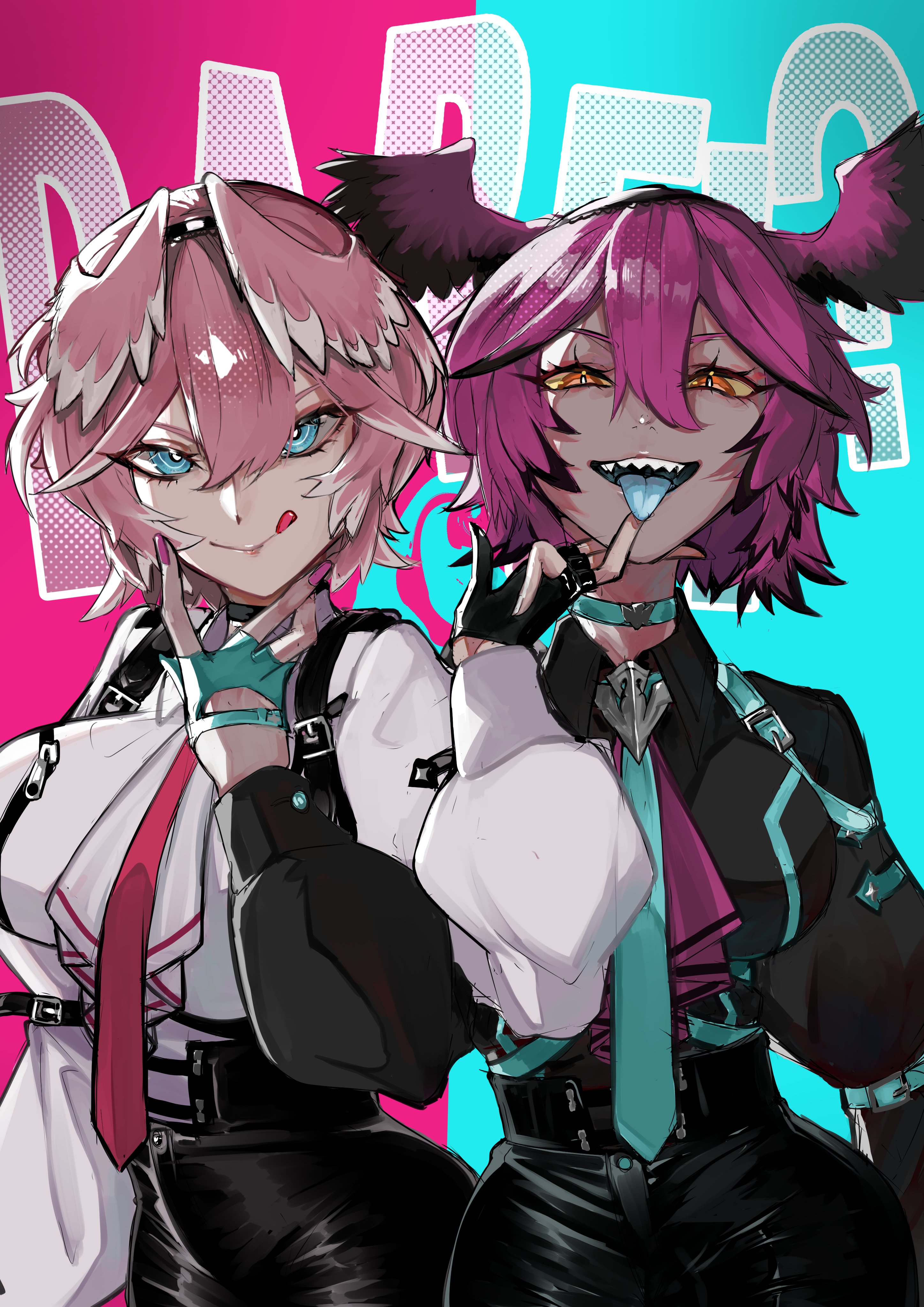 black glovesblack shirtblue eyesblue glovesblue tongueblushbreast zipperbreastscolored tonguedark personadual personaevil eyesevil smilefingerless glovesgloveshair between eyeshairbandhead wingshigh-waist shortslarge breastsleather shortslight personalong sleeveslooking at viewermulticolored hairmultiple girlsnecktiepink hairpink necktiepink wingspuffy long sleevespuffy sleevesshirtshort hairshortssmiletaut clothestonguetongue outvirtual youtuberwhite shirtwingsyellow eyes