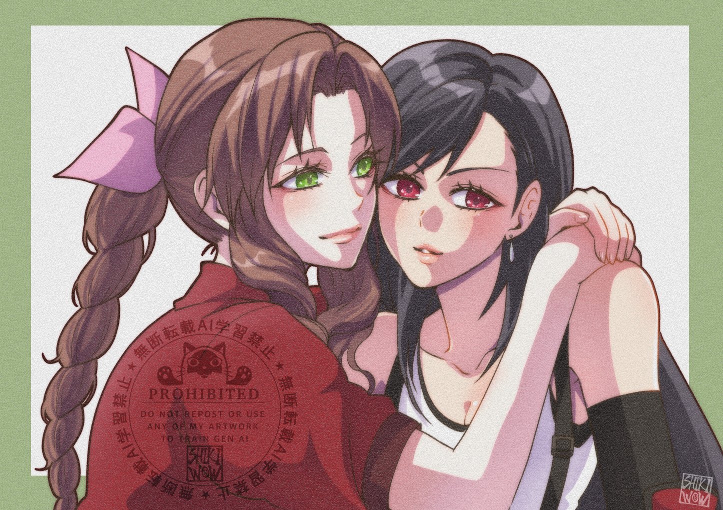 2girlsarms around neckbare shouldersblack brablack glovesblack hairborderbrabraidbraided ponytailbreastsbrown haircleavageclosed mouthearringselbow gloveselbow padsglovesgreen bordergreen eyeshair ribbonjacketjewelrylong hairmedium breastsmultiple girlsparted bangsparted lipspink ribbonred eyesred jacketribbonshirtshort sleevessidelockssignaturesingle braidsingle elbow padsleevelesssleeveless shirtsports brasuspendersunderwearupper bodywhite backgroundwhite shirtyuri