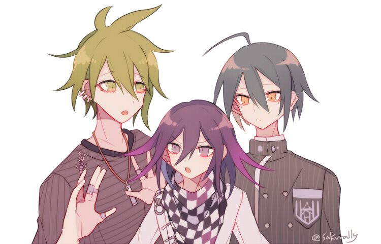 3boysaegyo salahogeannoyedantenna hairblack jacketblack scarfbreast pocketbroochbuttonschaincheckered clothescheckered scarfclosed mouthcollarbonecollared jacketcolored tipscrestdouble-breastedear piercingexpressionlesseyelashesfrownfurrowed browgreen eyesgreen hairgrey hairgrey shirthair between eyeshands upheight differencehigh collarjacketjewelrylong eyelasheslong hairlong hair between eyeslooking at anothermale focusmedium hairmessy hairmulticolored hairmultiple boysmultiple piercingsmultiple ringsopen mouthpendantpiercingpinstripe jacketpinstripe patternpocketpointy nosepurple eyespurple hairringscarfshirtshort hairshort sleevessimple backgroundstriped clothesstriped shirtsurprisedtwitter usernametwo-tone scarfundershirtupper bodyvertical-striped sleeveswhite backgroundwhite jacketwhite scarfyellow eyes