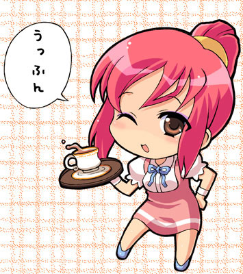1girlblue shoesbrown eyeschibicupfemale focushand on own hipone eye closedpink hairponytailshoessmilesolospeech bubbleteacuptraywaitresswink