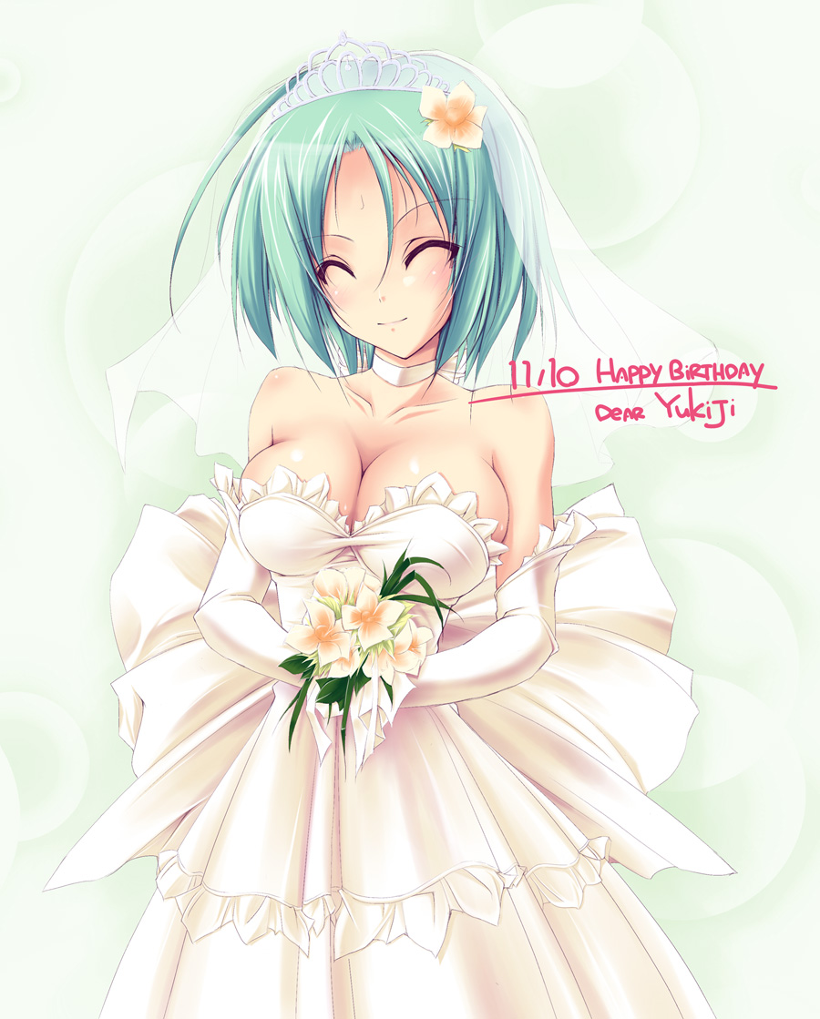 00s1girlbouquetbreastsbridecleavageclosed eyesdressfemale focusflowergreen hairhair flowerhair ornamentlarge breastssolowedding dress