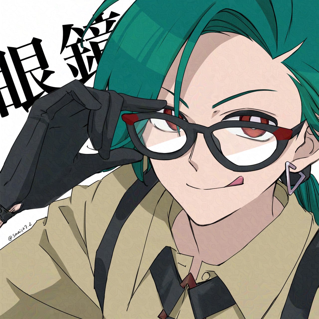 1girladjusting eyewearahogeandrogynousasymmetrical bangsblack glovesblack necktiebright pupilscat eye-framed eyewearclosed mouthcollared shirtearringsglassesglasses dayglovesgreen hairjewelrylong hairnecktiered eyesreverse trapsaai127 2shirtsmilesolosuspenderstonguetongue outtriangle earringsupper bodywhite pupils