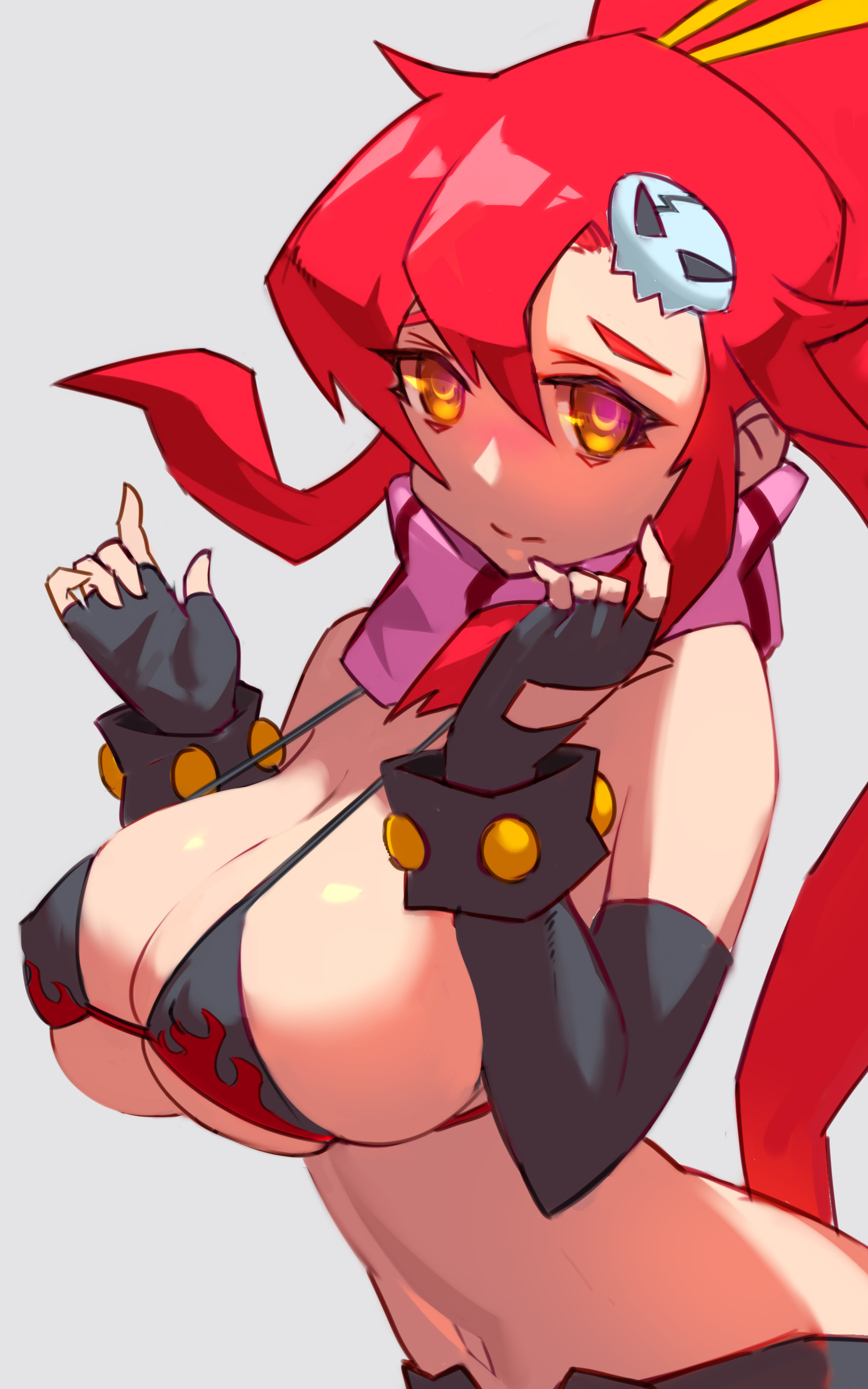 1girlbikinibikini top onlyblack glovesbreastsclosed mouthelbow glovesfingerless glovesflame printglovesgrey backgroundhair ornamentlarge breastslong hairlooking at viewernavelpink scarfred hairscarfsimple backgroundskull hair ornamentsoloswimsuitupper bodyvery long hairyellow eyes