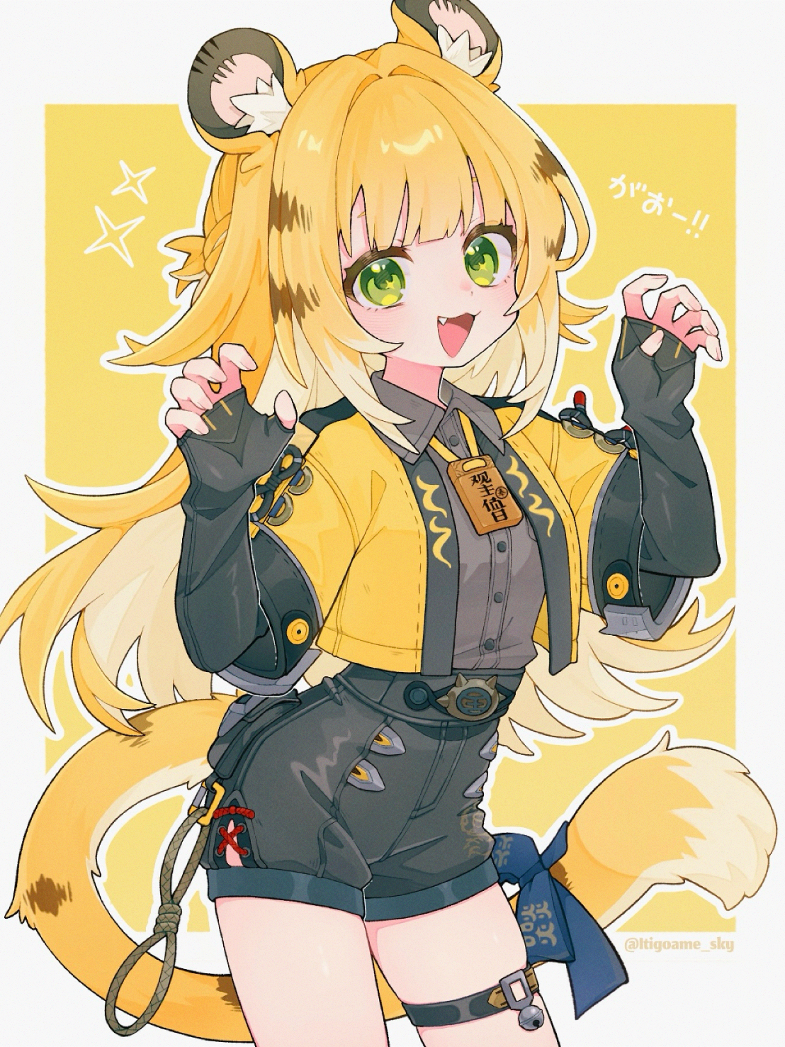 1girlanimal ear fluffanimal earsblack glovesblonde haircolored inner hairfingerless glovesglovesgreen eyesitigoame skylong hairlooking at viewermulticolored hairopen mouthshirtsmilesolotailthigh straptiger earstiger girltiger tailwhite hair