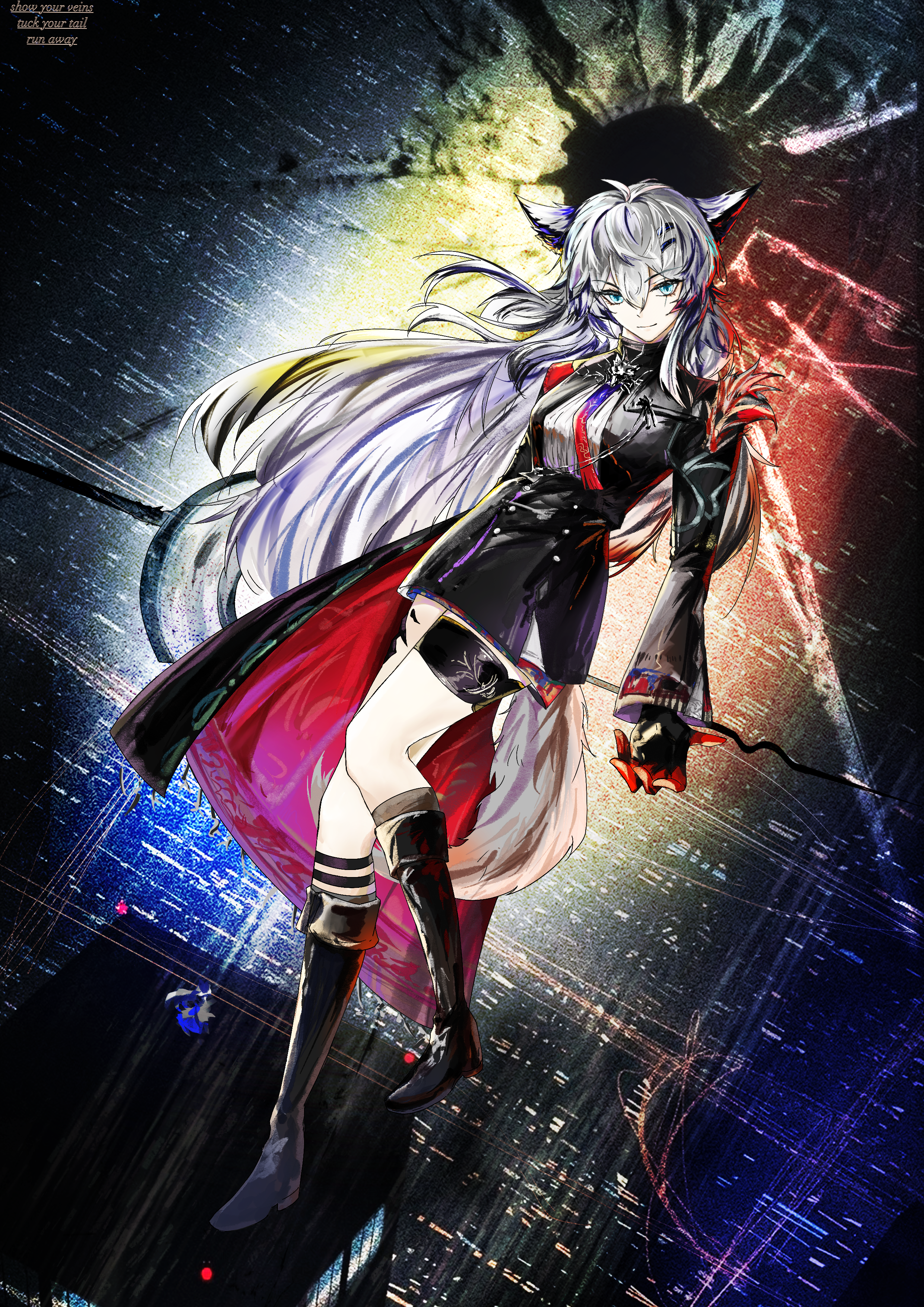 1girlabstract backgroundaiguillettealbtraumanimal earsblack bootsblack capeblack glovesblack jacketblack skirtblue eyesbolo tiebootscapeclosed mouthenglish textfull bodygloveshair between eyeshair ornamenthairclipitalian commentaryjacketknee bootslight smilelong hairlong sleeveslooking at viewermaterial growthoripathy lesion (arknights)red capered glovesscarscar across eyescar on faceshin strapskirtsolotailthigh straptwo-sided capetwo-sided fabricvery long hairwhite hairwhite tailwolf earswolf girlwolf tail