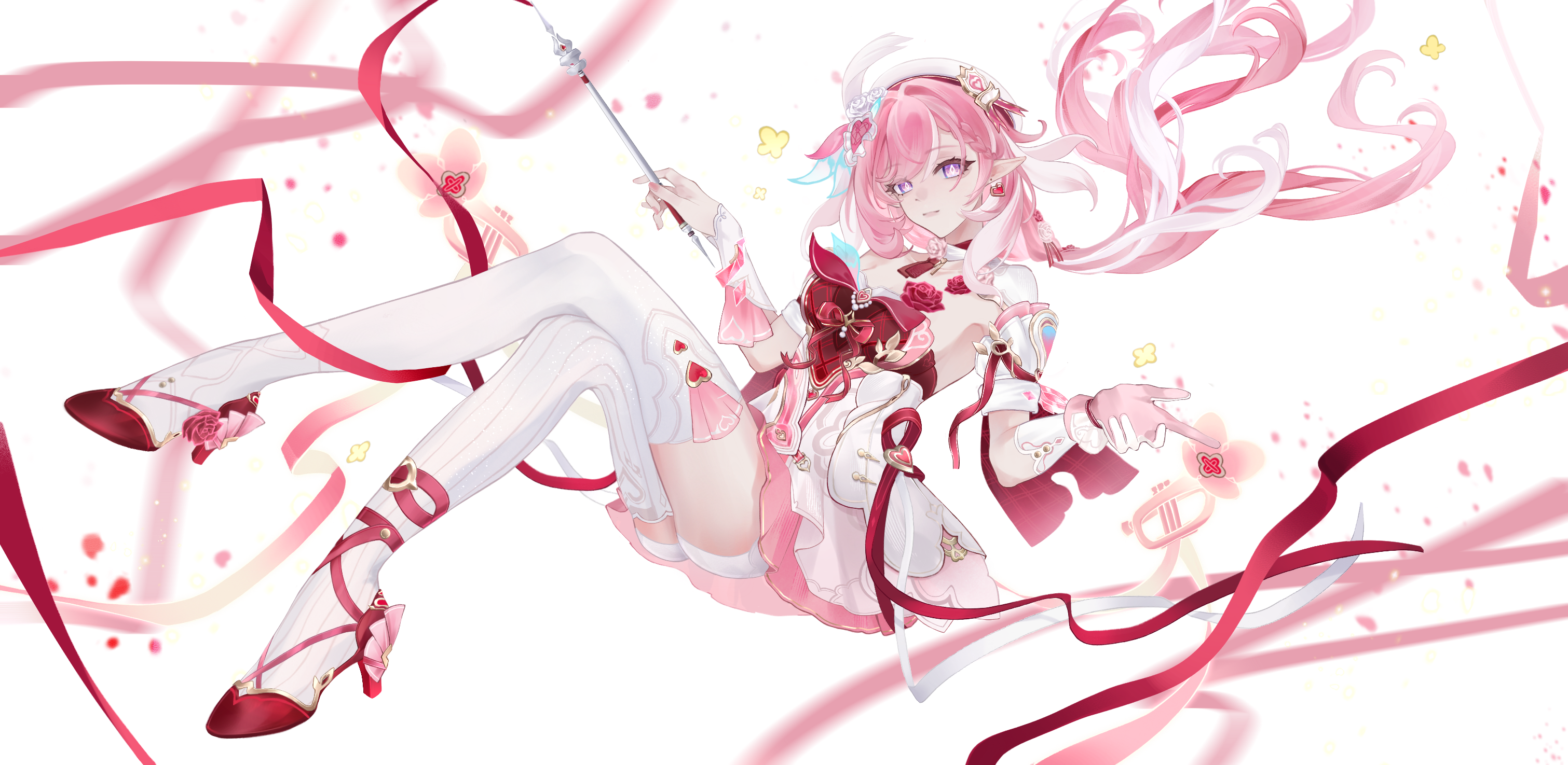 1girlberetbreastscrossed legsdiamond (shape)diamond-shaped pupilsdressearringselffloatinghatheartheart earringshigh heelsholdingholding wandinstrumentjewelrylarge breastslong hairmulticolored dressmulticolored hairpantyhosepink hairpointy earspurple eyesred dresssimple backgroundsingle leg pantyhosesingle thighhighsmilesolosymbol-shaped pupilsthighhighsthighstrumpettwo-tone hairvery long hairwandwhite backgroundwhite dresswhite hairwhite pantyhosewhite thighhighs