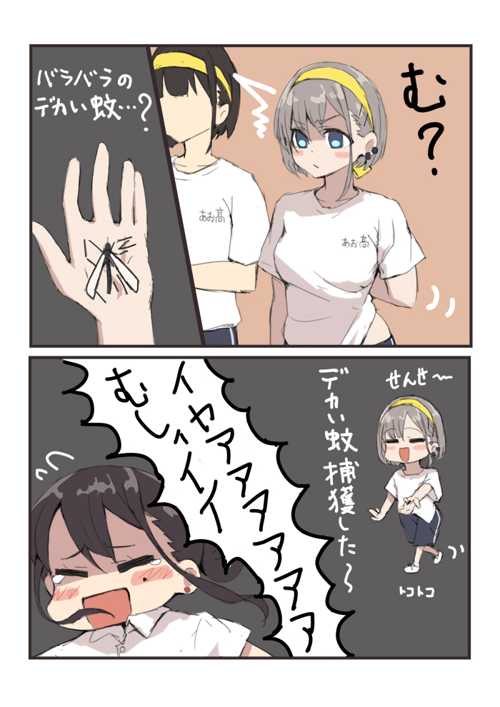 :d1boy3girlsarm behind backblack hairblack shortsblue eyesblush stickersbugclosed eyesclosed mouthgrey hairhairbandinsectmosquitomultiple girlsopen mouthshirtshort hairshort sleevesshortssmilewhite shirtyellow hairband