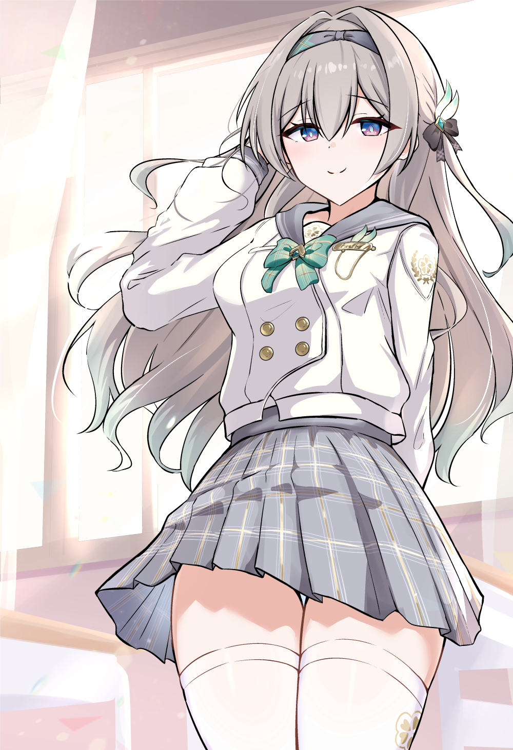 1girlarm behind backblack hairbandbowclosed mouthgradient hairgreen bowgreen hairgrey hairgrey skirthairbandhand in own hairlong hairlooking at viewermulticolored hairofficial alternate costumepink hairplaid bowplaid clothesplaid skirtschool uniformserafukuskirtsmilesolothick thighsthighhighsthighswhite thighhighszettai ryouiki