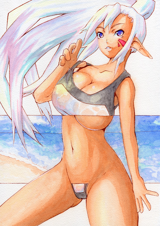 1girlbeachblue eyesbreastscleavageelffemale focushuge breastslong hairpointy earsponytailsoloswimsuittattoounderboobwhite hair