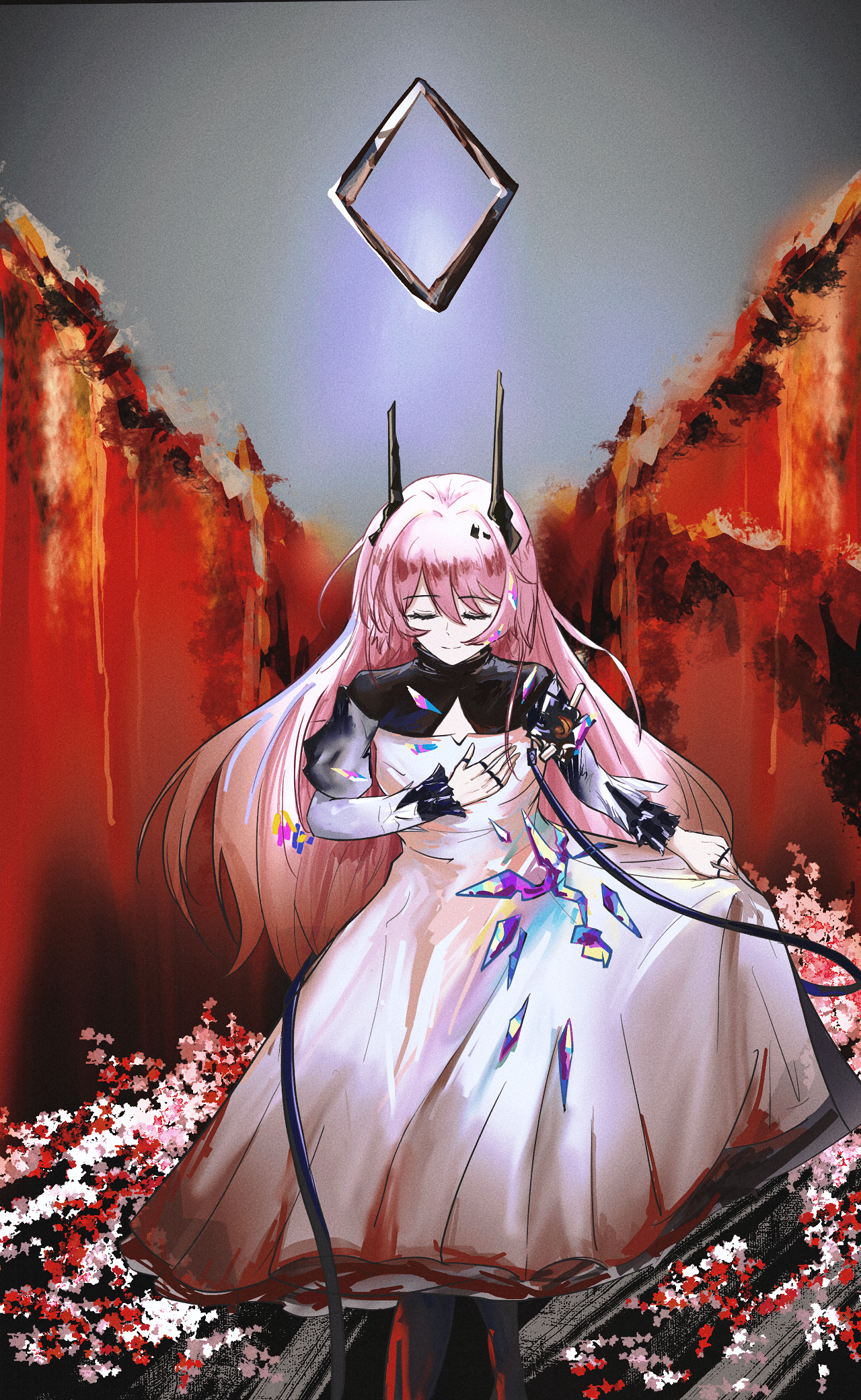 1girlalbtraumblack hornscleavage cutoutclosed eyesclosed mouthclothing cutoutcurtseydressfacing viewerfireflowerhair between eyeshornsjewelrylong hairlong sleevesmultiple ringspink hairred flowerringskirt holdsmilesolostandingwhite dresswhite flower
