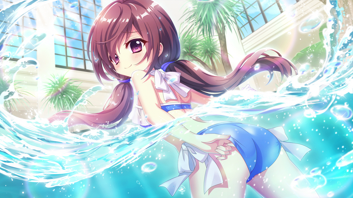 1girlalternate hairstyleassbikiniblue bikiniblue skyblushbowbow bikinibreastsclosed mouthcowboy shotdayfilm grainfrilled bikinifrillsfrom behindhair over one eyehair tieindoorslens flarelight rayslong hairlooking at viewerlooking backlow twintailsmizushino sonopalm treepartially submergedpurple eyespurple hairskysmall breastssmilesolosparklesplashingswimsuitswimsuit tugtreetwintailswhite bowwindow