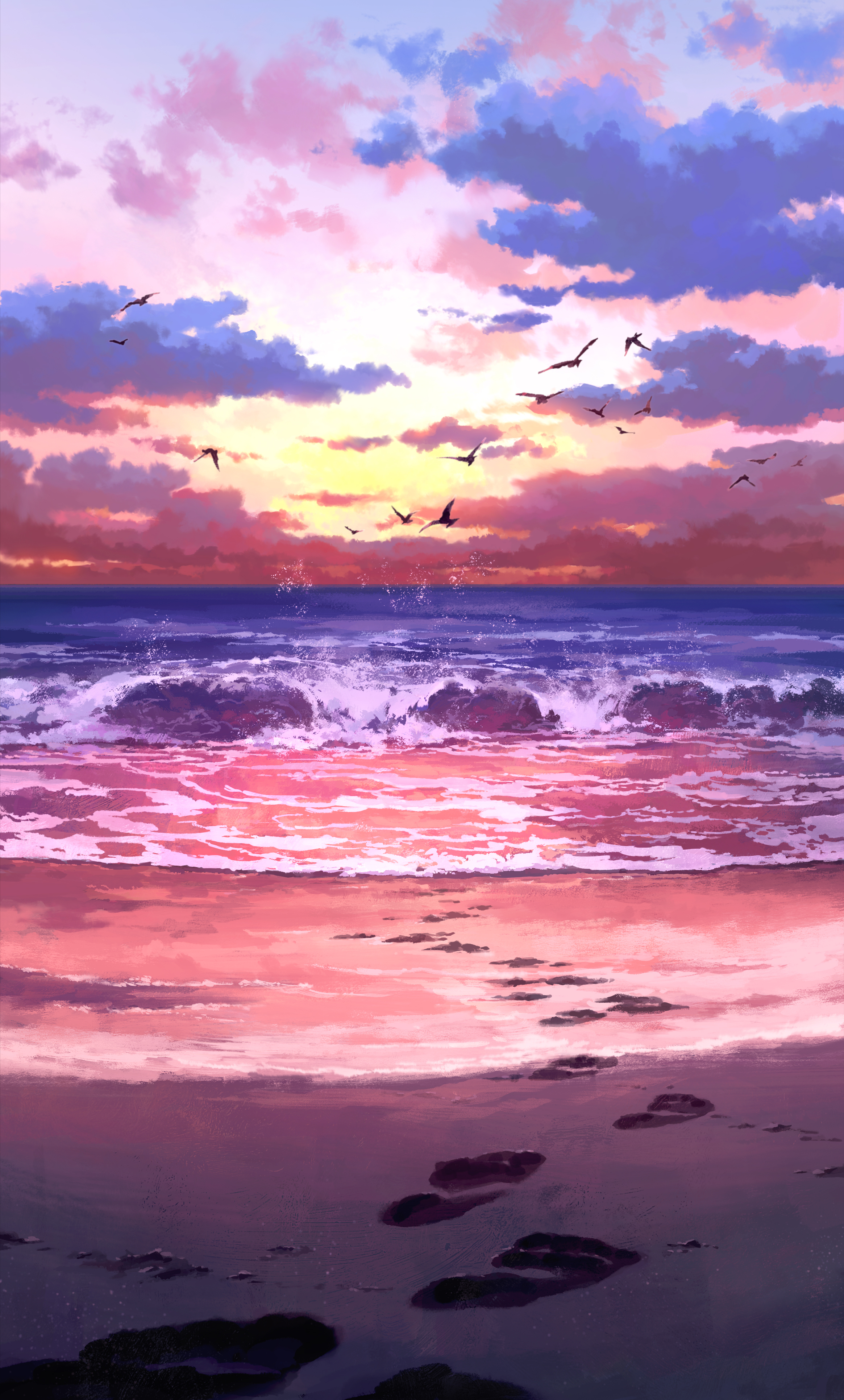 beachcloudcloudy skyfootprintsgradient skyhorizonmulticolored cloudsno humansoceanoutdoorssandscenerysimple backgroundskysunsetwaves
