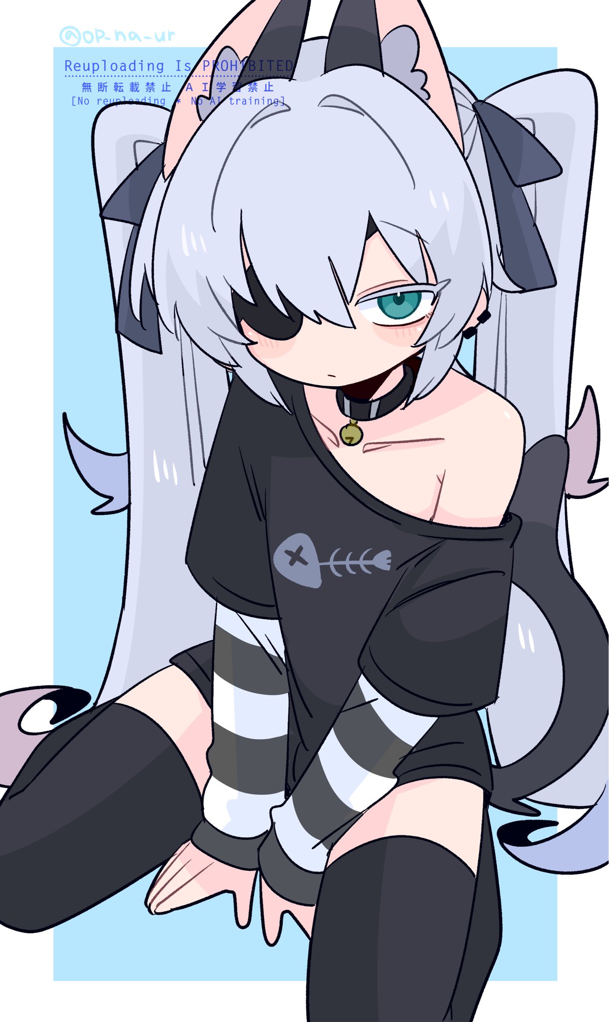 1boyanimal ear fluffanimal earsbellbetween legsblack collarblack shirtblack sleevesblack thighhighsblue backgroundblue eyesborderbowcat boycat earscat tailcollarcollarbonecrossdressingcrossdressing (mtf)ear piercingexpressionlessextra earseyepatchfish skeletonflipped hairfrom abovefull bodygrey bowgrey tailhair between eyeshair bowhand between legslayered sleeveslight blushlong hairlong sleeveslooking at viewerneck bellone eye coveredoversized clothespiercingprint shirtraised inner eyebrowsrigel (op na yarou)seizashirtshort over long sleevesshort sleevessidelockssimple backgroundsingle bare shouldersingle off shouldersittingsleeves past wristssolostriped sleevestailthighhighsthighstraptwintailsv armsvery long hairwatermarkwhite borderwhite hairwhite sleeveszettai ryouiki