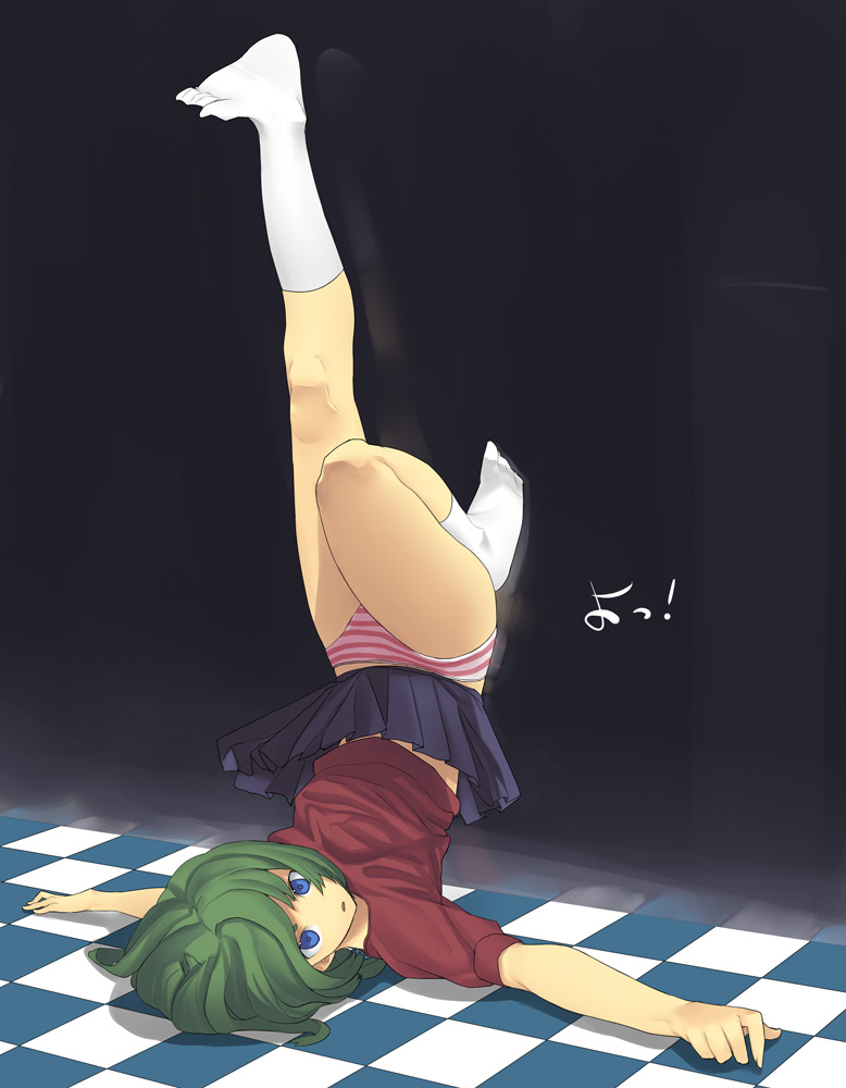 1girlblue eyescheckered floorfemale focusflexiblefloorgreen hairkneehighsleg liftlooking at vieweroutstretched armspantiespantyshotskirtsockssolospread armsstriped clothesstriped pantiesunderwearupside-downupskirtwhite socks