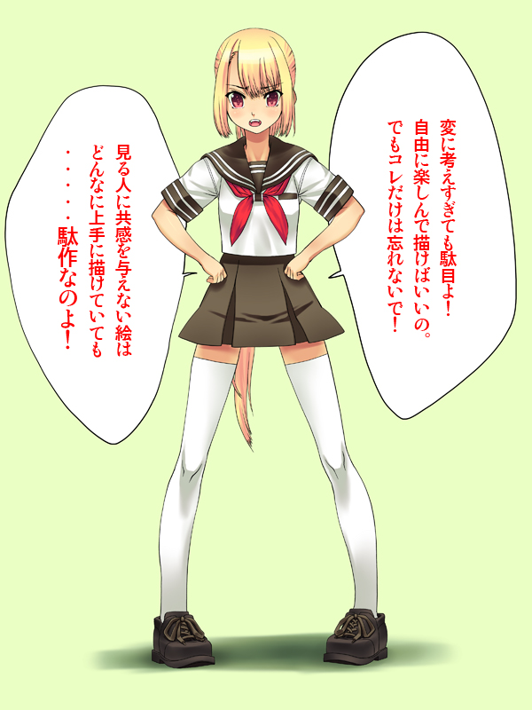 blonde hairhands on own hipslong hairred eyesschool uniformserafukusolostandingthighhighsvery long hairzettai ryouiki
