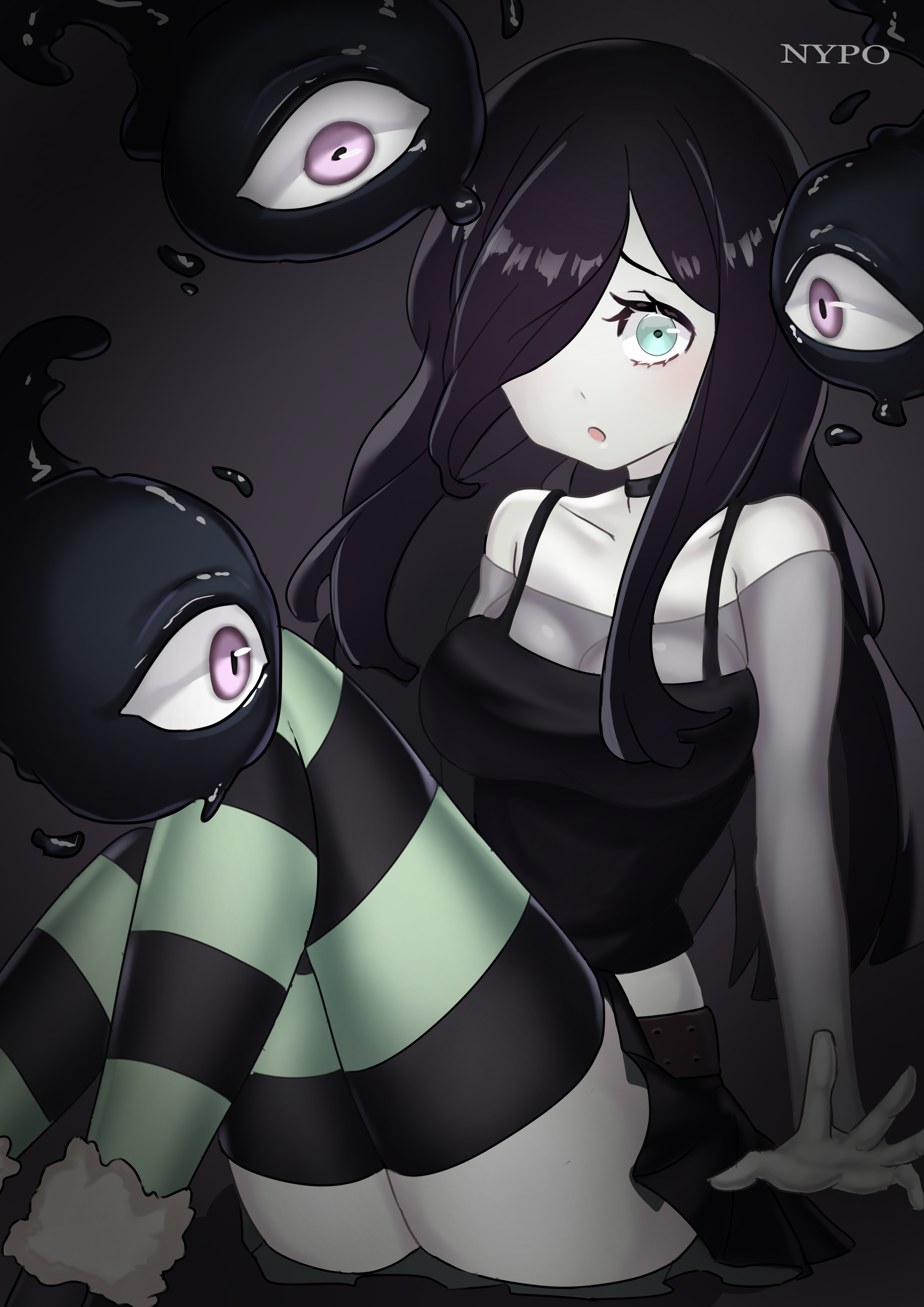 rurikon, original, highres, 1girl, black background, black hair, black ribbon, black skirt, high-waist skirt, long sleeves, ribbon, shirt, shirt tucked in, skirt, solo, white shirt