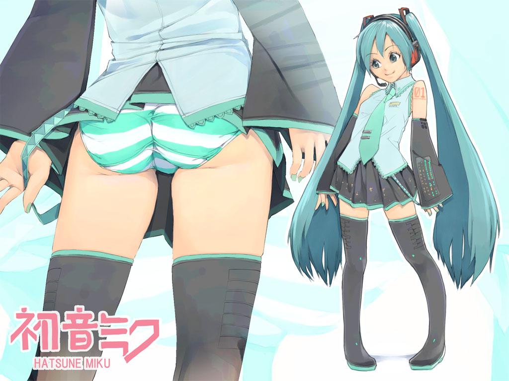 aqua hairassclose-updetached sleevesheadsetlong hairmicrophonenecktiepantiesskirtstriped clothesstriped pantiesthighhighstwintailsunderwearzettai ryouiki