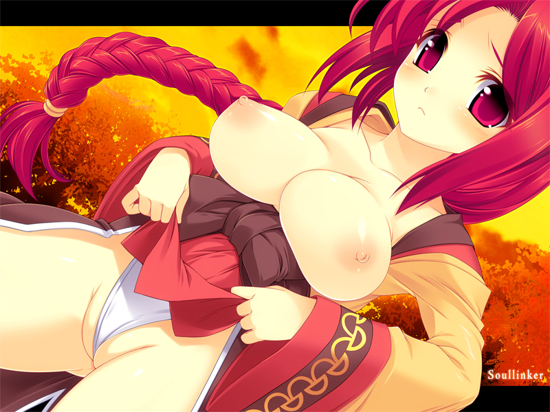 1girlblushbraidbreastscharacter nameclothes liftcollarbonedutch angleembarrassedfemale focusfrontal wedgiegroinlarge breastslong hairlooking at viewernipplespantiesred eyesred hairskirtskirt liftsolounderwearwedgiewhite pantieswide sleeves