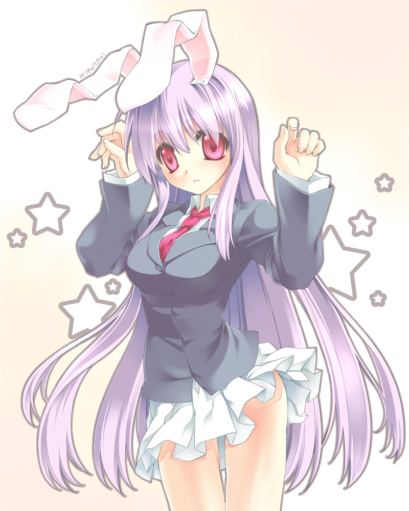 1girlanimal earsbreastsfemale focusgradient backgroundlarge breastslong hairminiskirtpurple hairrabbit earsred eyesskirtsolovery long hairwhite background