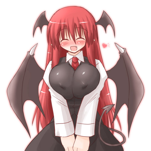 :d1boy1girlbat wingsblushbreastsclosed eyescovered erect nipplesdemon girldemon taildress shirtfangfemale focushappyhead wingshearthuge breastsimpossible clothesimpossible shirtlong hairlong sleevesnecktieopen mouthred hairred necktieshirtsmilesolotailv armsvestwings