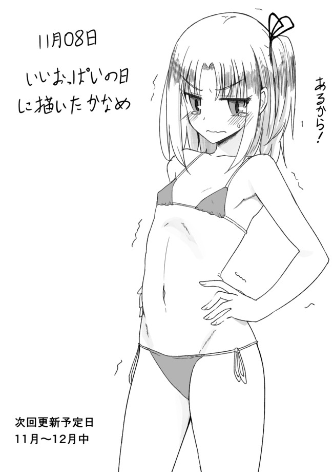 1girlbare shouldersbikiniblushclosed mouthcollarbonecovered erect nipplescowboy shotdatedflat chestgreyscalehands on own hipskanagiri kanamekunoichi hajimemashita!looking at viewermedium hairmicro bikinimonochromenavelone side upparted bangsribbonshort hairside-tie bikini bottomsidelockssimple backgroundsolostandingsweatswimsuittearing uptremblingv-shaped eyebrowswavy mouth