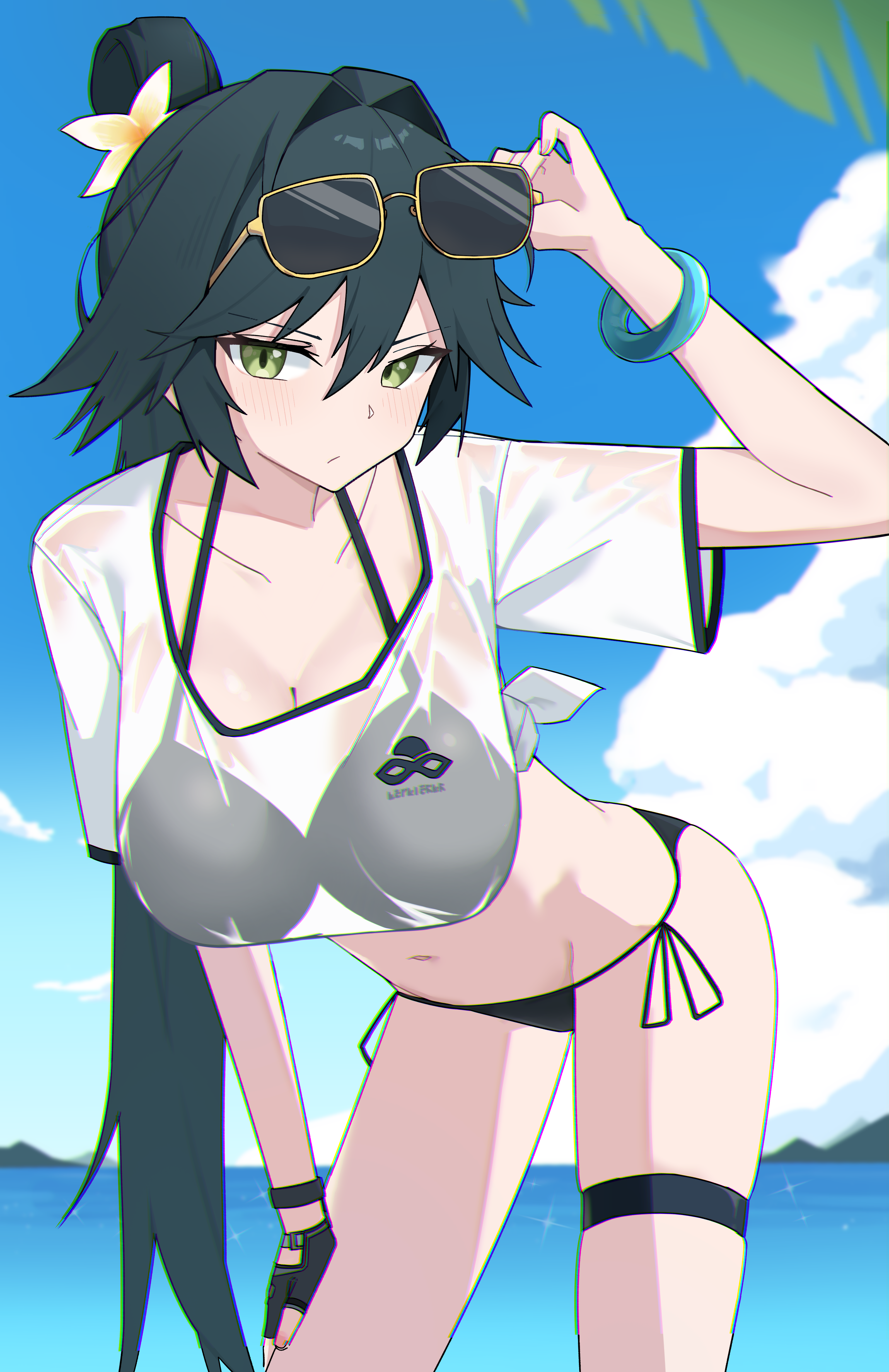 hechima koubou, amamiya chihiro, yumemochi mel, mesu game ~tsukamareba soku nakadashi! 100 hyaku oku-en to chijoku o kaketa survival~, 2girls, :3p, ass, ass focus, bikini, black hair, blue bikini, blue eyes, blush, breasts, brown eyes, brown hair, chastity belt, clenched teeth, dripping, fingering, floral print bikini, flower, forest, frilled bikini, frills, grabbing from behind, hair flower, hair ornament, hairclip, heart, heart-print bikini, heart print, in heat, large breasts, long hair, looking back, medium hair, multiple girls, nature, open clothes, open mouth, pussy juice, red bikini, running, sex toy, shiny skin, surprised, sweat, swimsuit, teeth, trembling, vibrator
