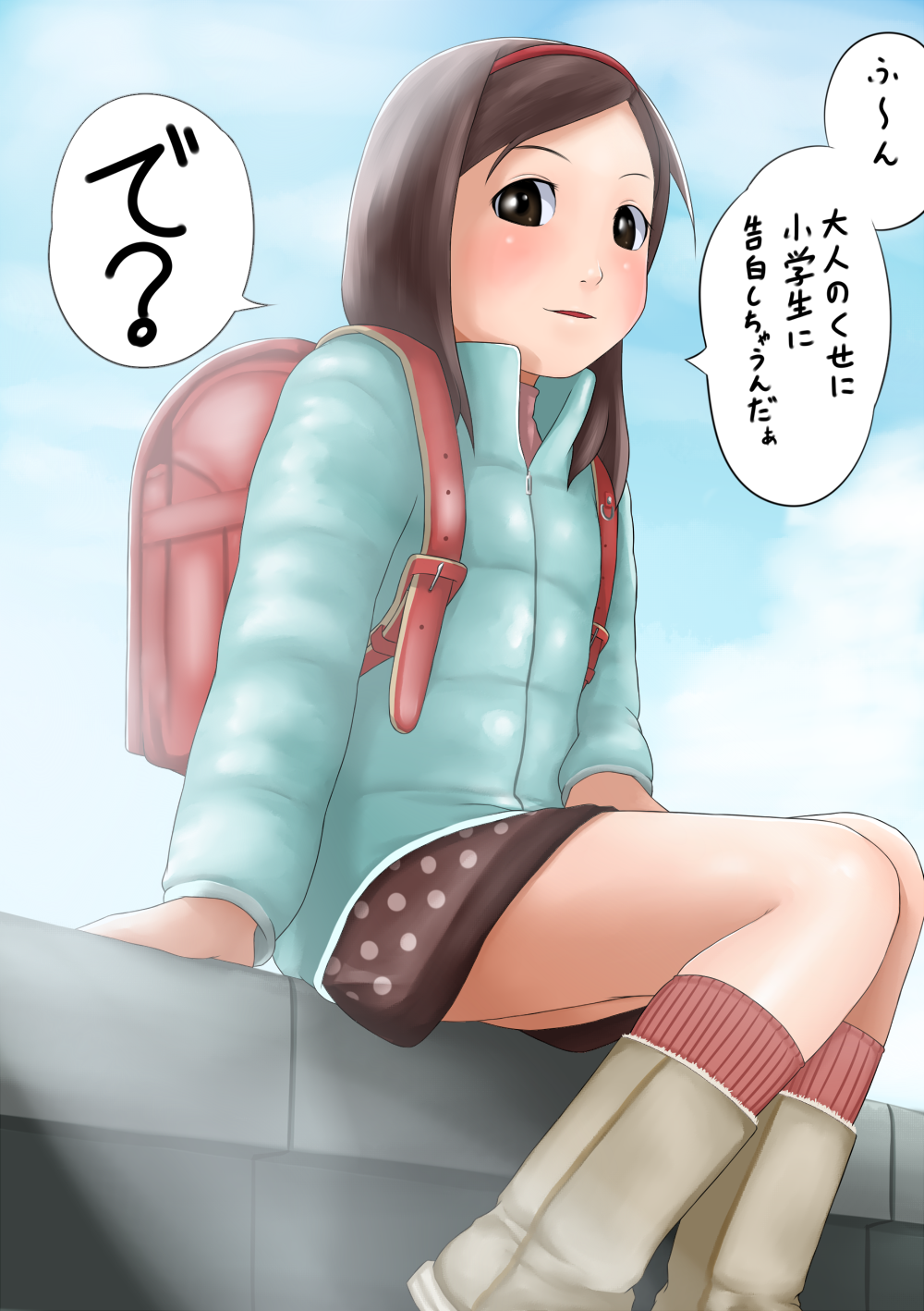1girlage differencebackpackbagblushbootsbrown eyesbrown hairchildconfessionfemale focuslegsoutdoorspolka dotpovrandoseruskirtsockssolo