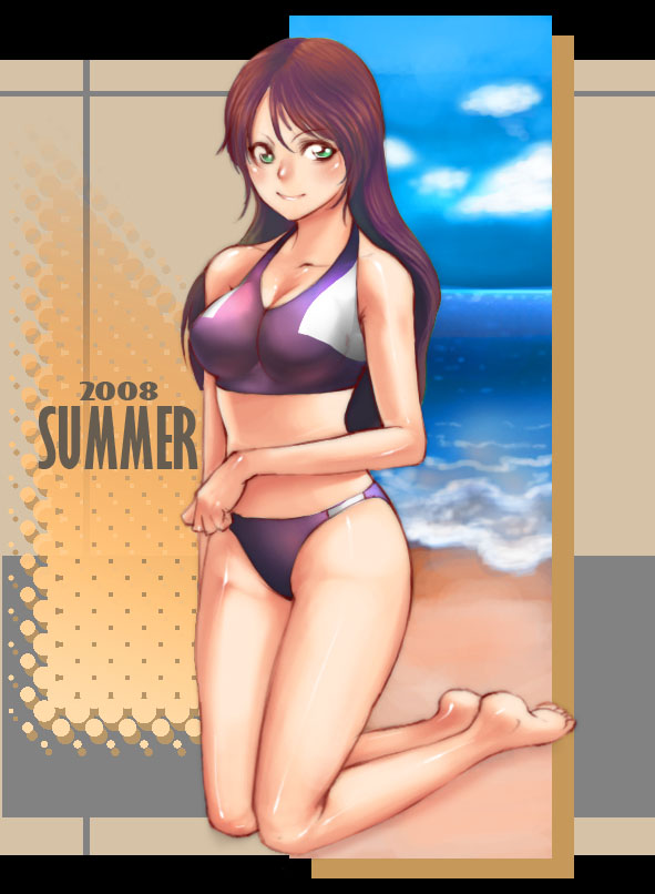 1girlbarefootbeachbikinibrown hairdayfemale focusgreen eyeshalftonehalftone backgroundkneelinglong hairsmilesolosports bikiniswimsuit
