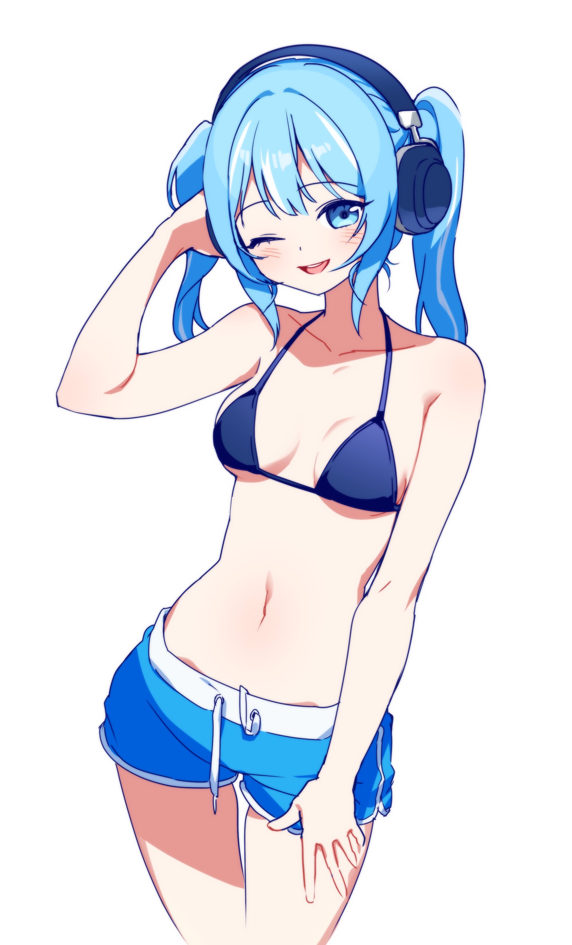 1girlaqua eyesaqua hairarm at sidebikiniblue bikiniblue shortsblushbreastscenter-flap bangscollarbonecowboy shotdolphin shortsgen 8 pokemonhand on own leghand upheadphoneslooking at viewermedium breastsmedium hairmulticolored hairnavelno shirtnyancul47one eye closedopen mouthshort shortsshortssimple backgroundsmilesolostandingstomachstreaked hairswimsuittwintailsvirtual youtuberwhite backgroundwhite streaks