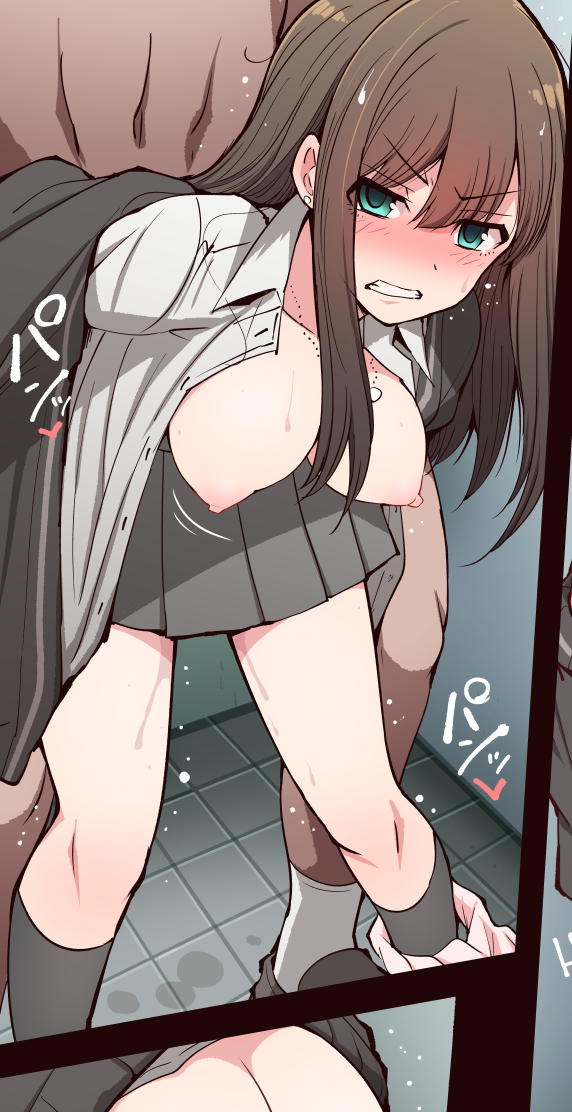 1boy1girlblack socksblushbouncing breastsbreastsbrown hairclenched teethclothed female nude malegrey shirthanging breastslarge breastslong hairnipplesnudeopen clothesopen shirtsexsex from behindshirtsockssolo focusstandingstanding sexteethwhite socks